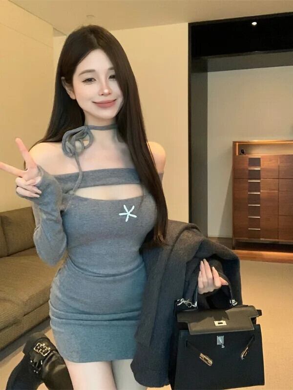 スパイシーガールオフショルダーセクシー長袖ドレス夏ウエストタイトラップヒップグレーショートドレス ロング サマー 夏物