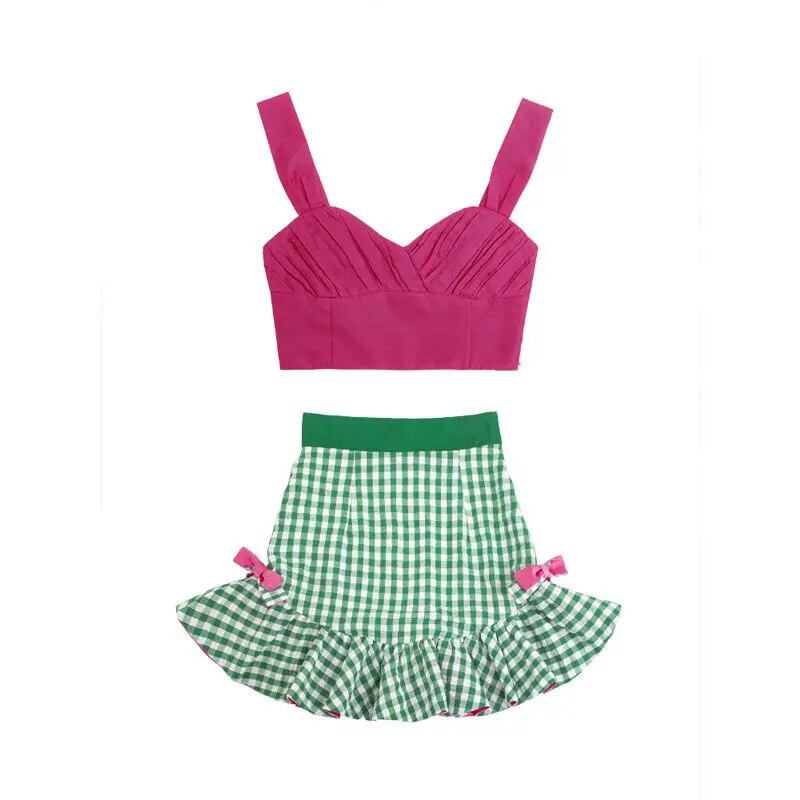 甘いホットガールレトロスーツ春夏プリーツショートキャミソールトップチェック柄プリーツミニスカート 2 点セット 大人ガーリー スウィート キュート カジュアル スプリング 春物 サマー 夏物