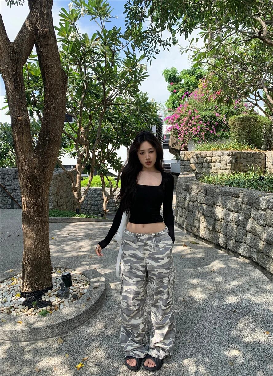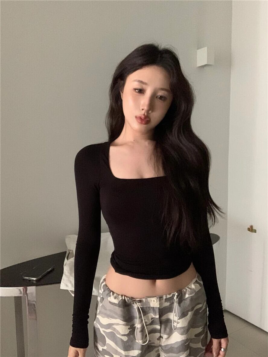 甘いホットガールソリッドカラースクエアカラー長袖 Tシャツ春タイト底シャツトップ ロング 大人ガーリー スウィート キュート カジュアル スプリング 春物 スクウェア