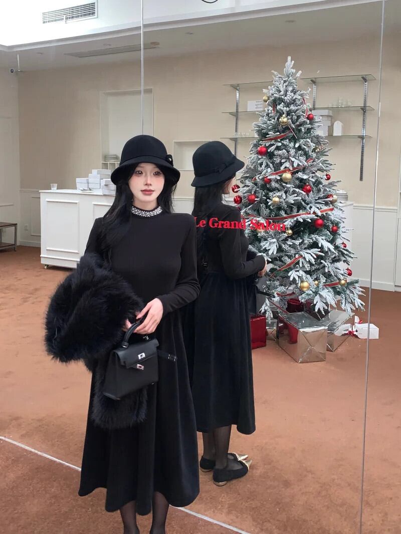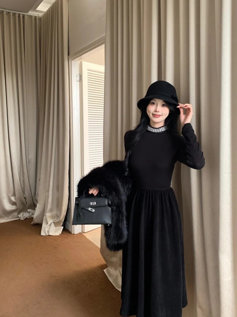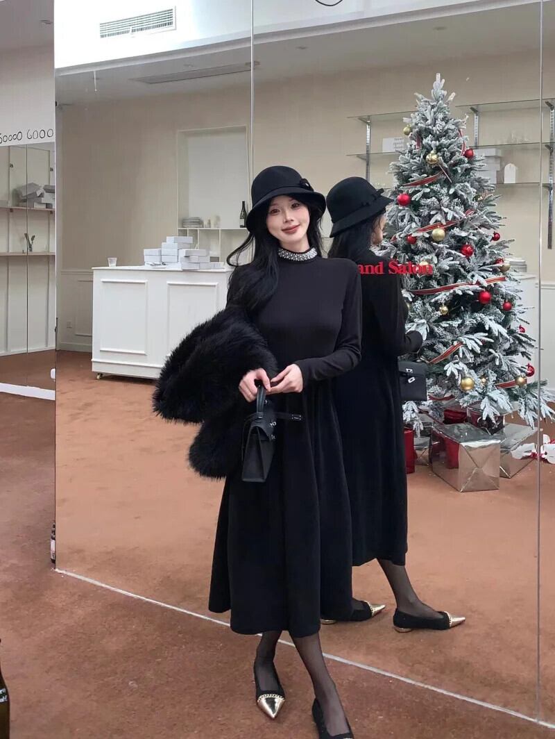 甘いホットガールブラックドレス秋/冬ハーフネック長袖スリムフィットロングドレス 大人ガーリー スウィート キュート カジュアル オータム 秋物 ウィンター 冬物