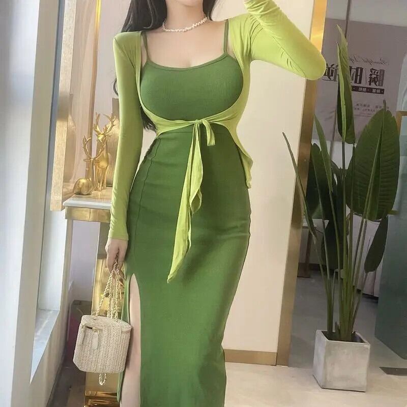 フランス純粋セクシースーツ春長袖カーディガンラップヒップストラップタイトドレスツーピースセット ロング スプリング 春物 ピュア