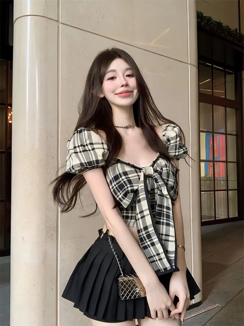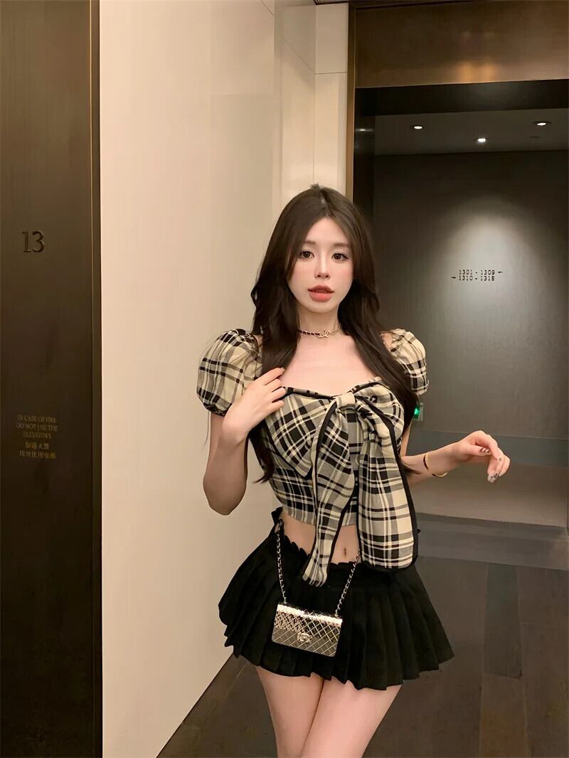 甘いホットガールレトロチェック柄半袖シャツ夏セクシー弓 O ネックスリムフィットショートシックトップ リボン 大人ガーリー スウィート キュート カジュアル サマー 夏物 Oネック