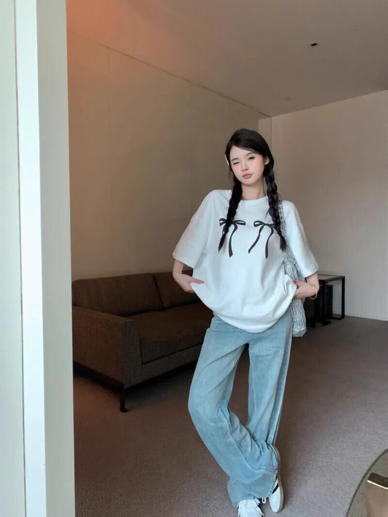 甘いホットガールシックリボンプリント O ネック半袖 Tシャツ夏ルーズホワイトトップ 大人ガーリー スウィート キュート カジュアル サマー 夏物 Oネック