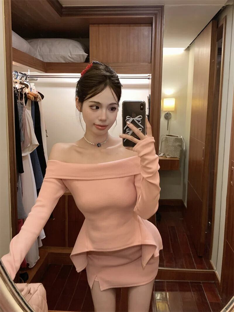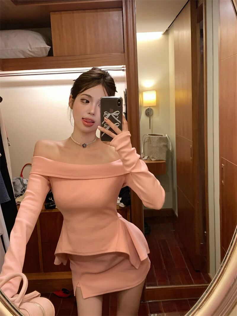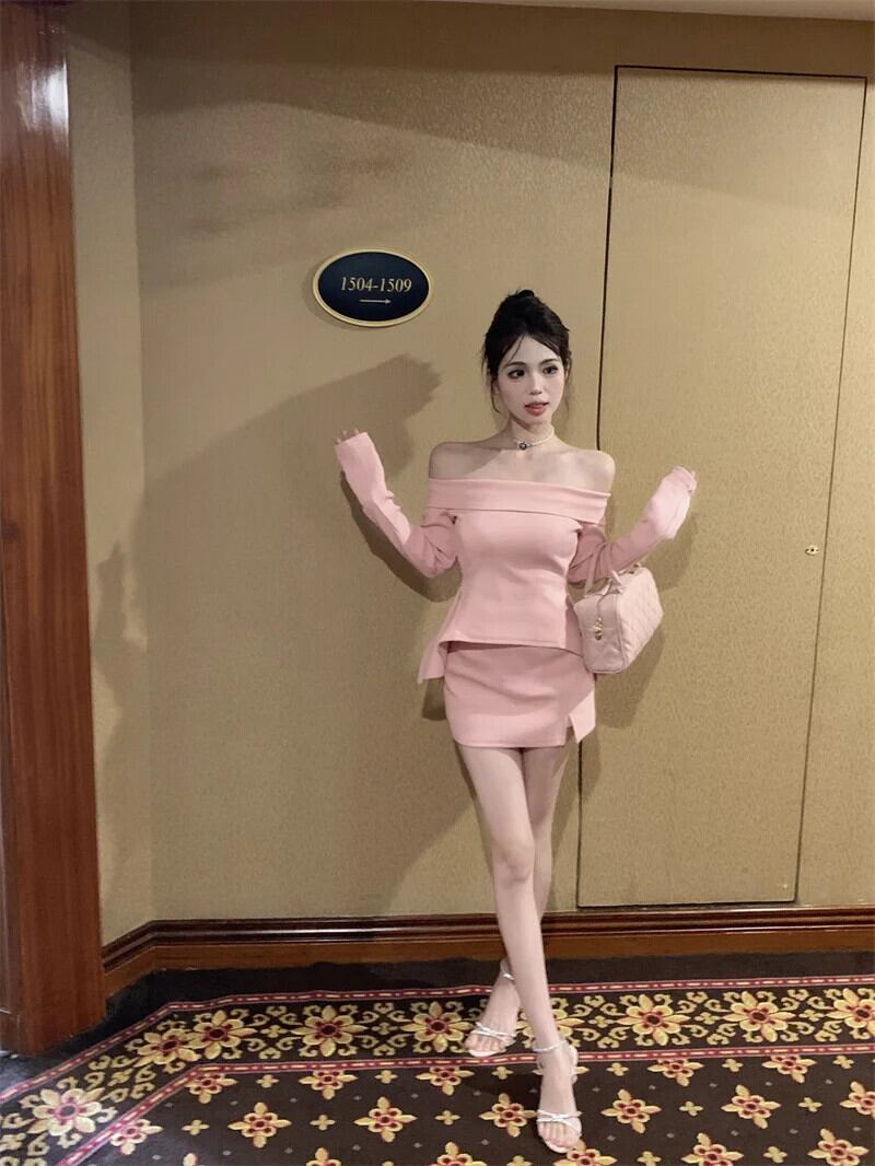 純粋セクシーホットガールスーツ春ピンクオフショルダー長袖ニットシャツスプリットラップヒップショートスカートツーピースセット ロング スプリング 春物