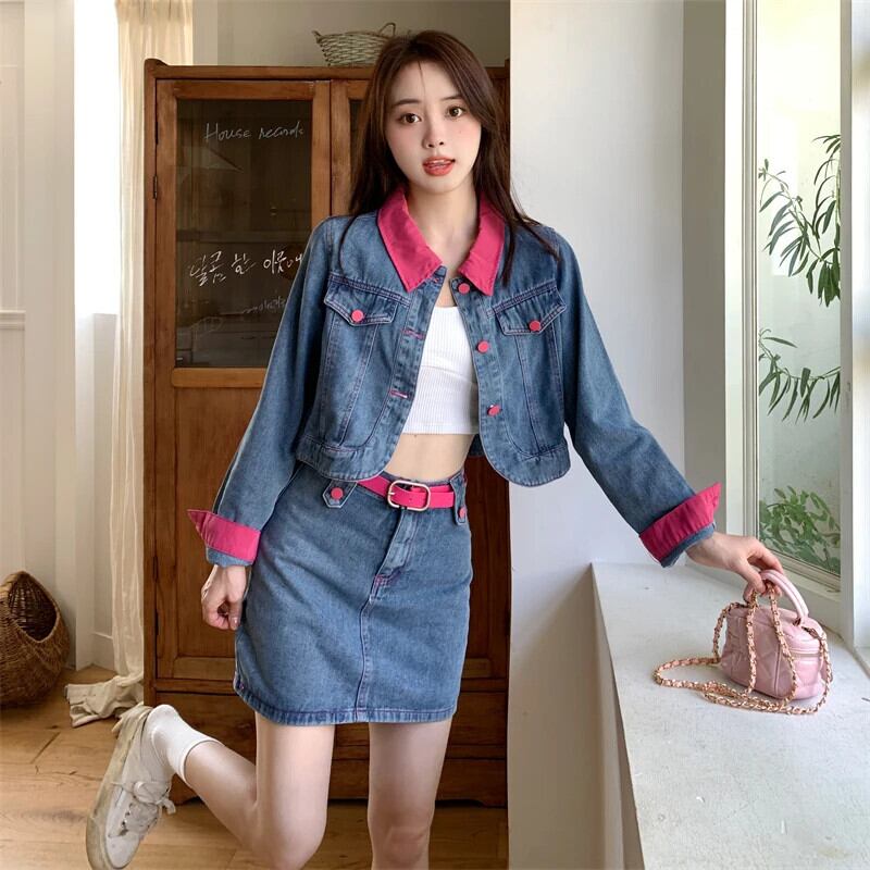甘いホットガールスーツ春ショートデニムジャケットウエスト A ラインミニスカート 2 点セット 大人ガーリー スウィート キュート カジュアル スプリング 春物 Aライン