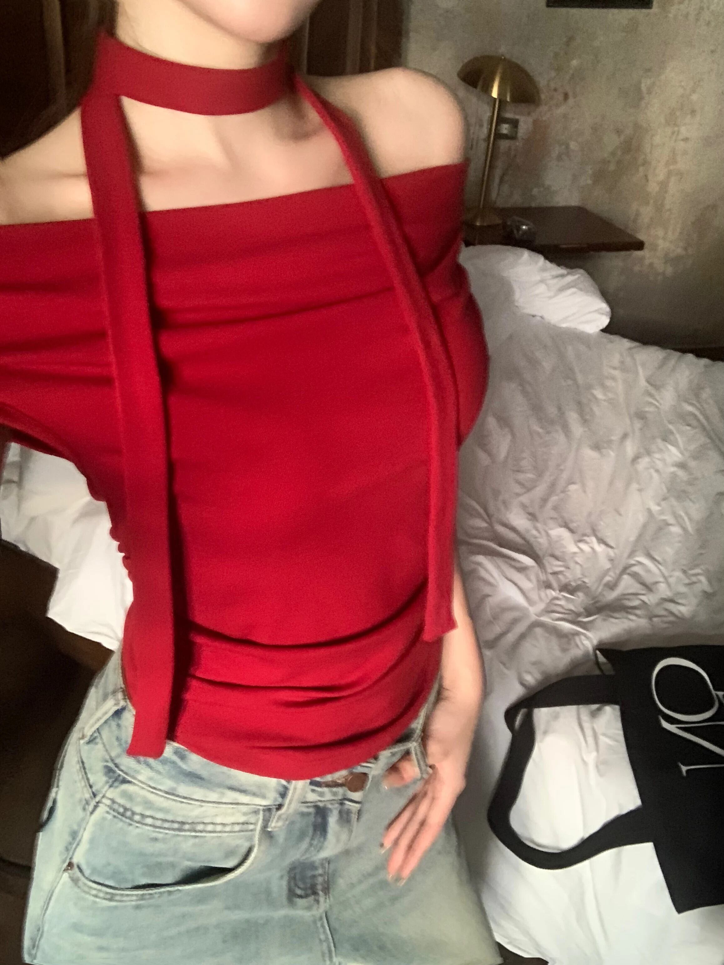 純粋セクシーホットガールオフショルダータンクトップ Tシャツ春スカーフスラッシュネックスリム弾性ショートトップ エラスティック 伸縮 スプリング 春物