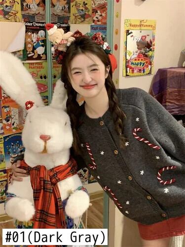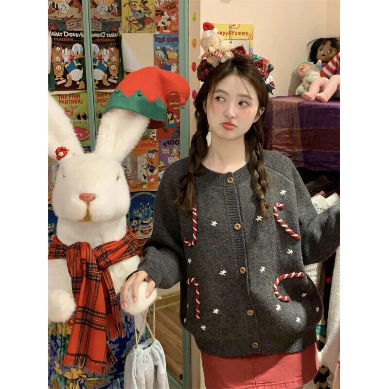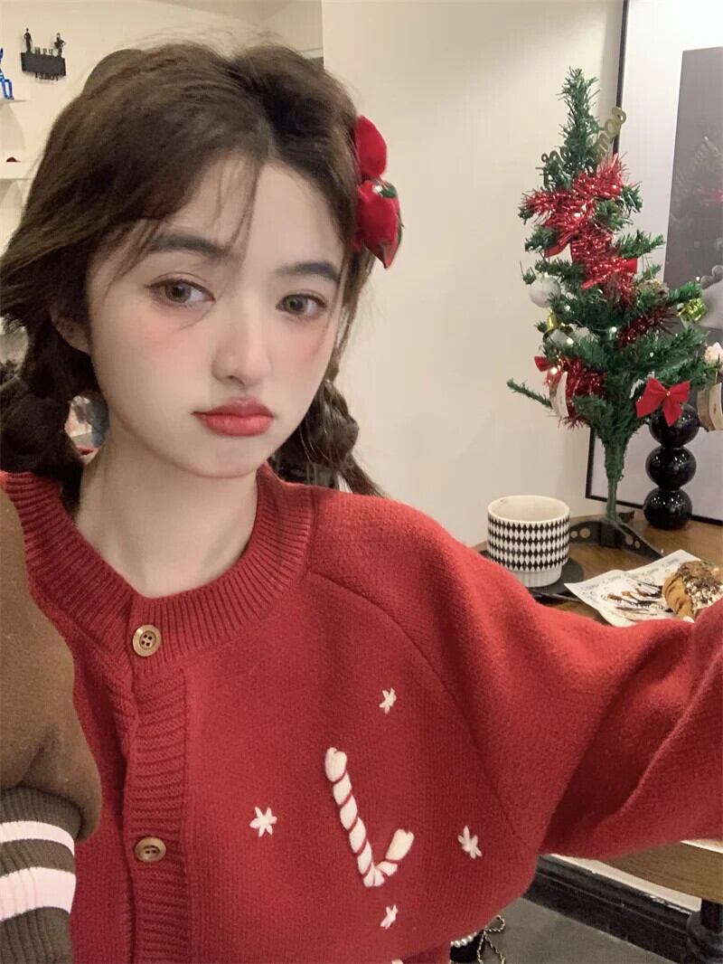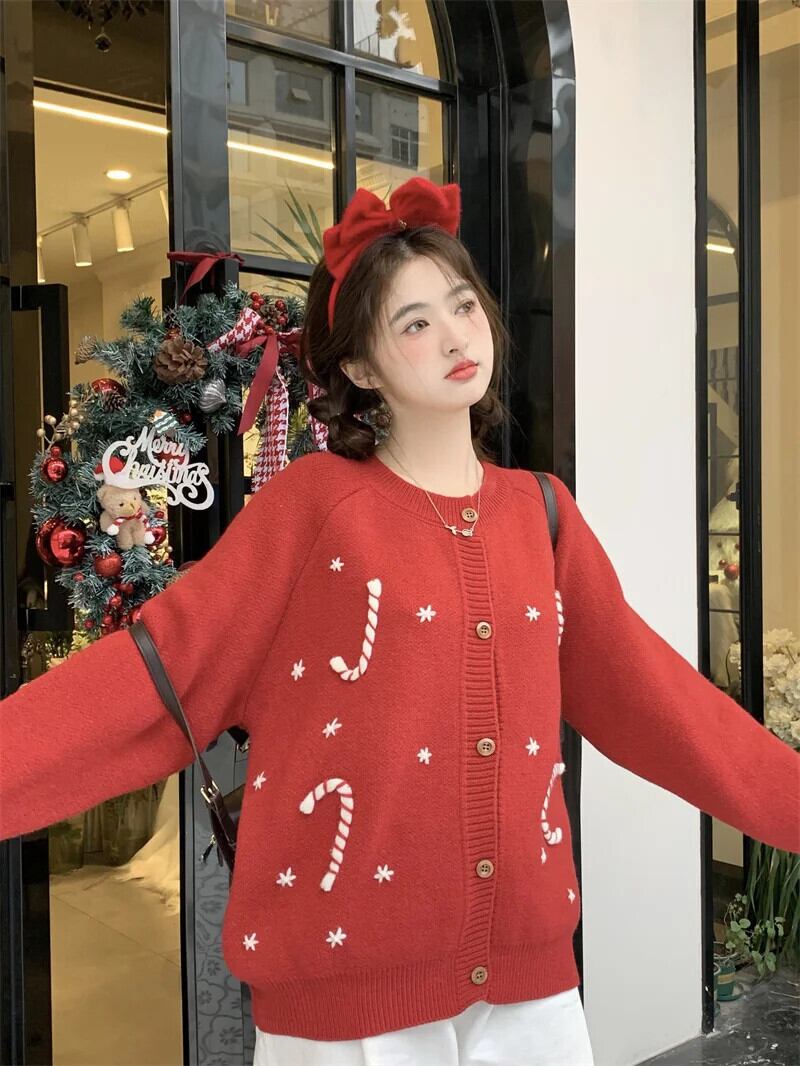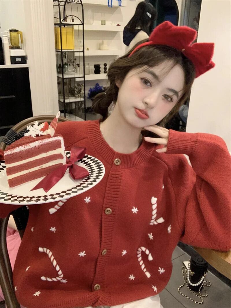 甘いホットガールクリスマス手作りかぎ針編み肥厚セータージャケット冬 O ネックルーズニットカーディガン 大人ガーリー スウィート キュート カジュアル ウィンター 冬物 Oネック