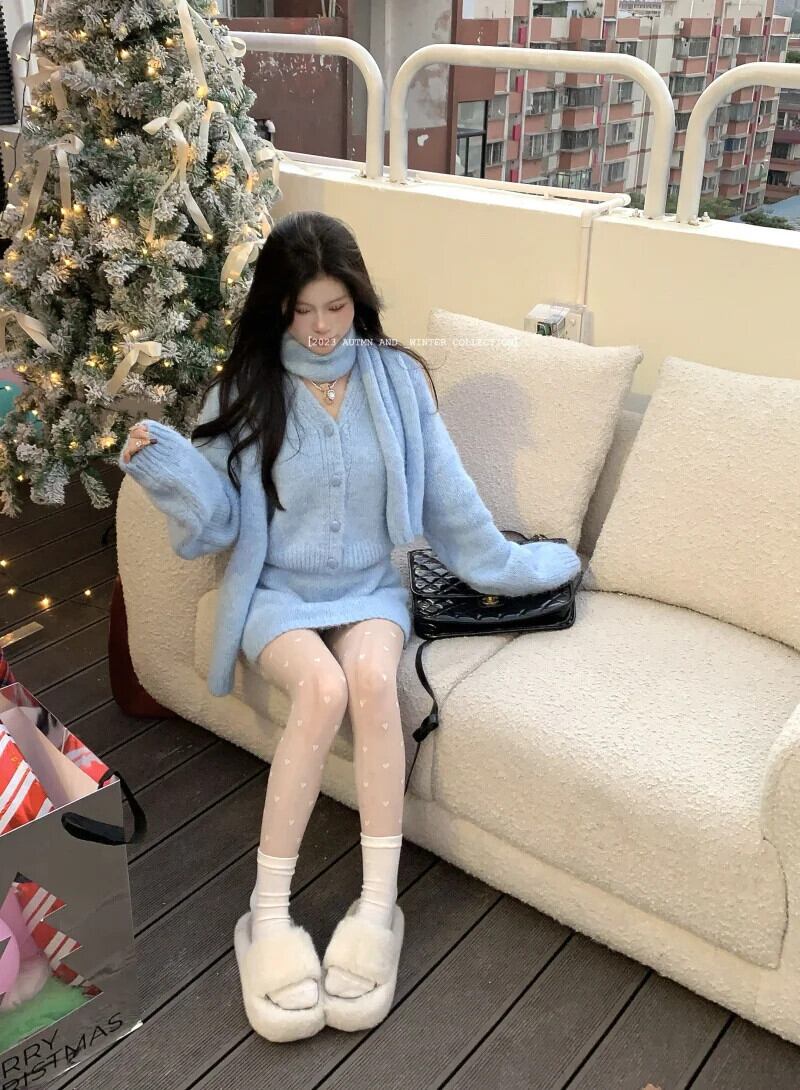 スイートホットガールスーツ秋と冬レッド V ネックニットカーディガンお尻ラップショートスカートスカーフ 3 点セット 大人ガーリー スウィート キュート カジュアル オータム 秋物 ウィンター 冬物 Vネック