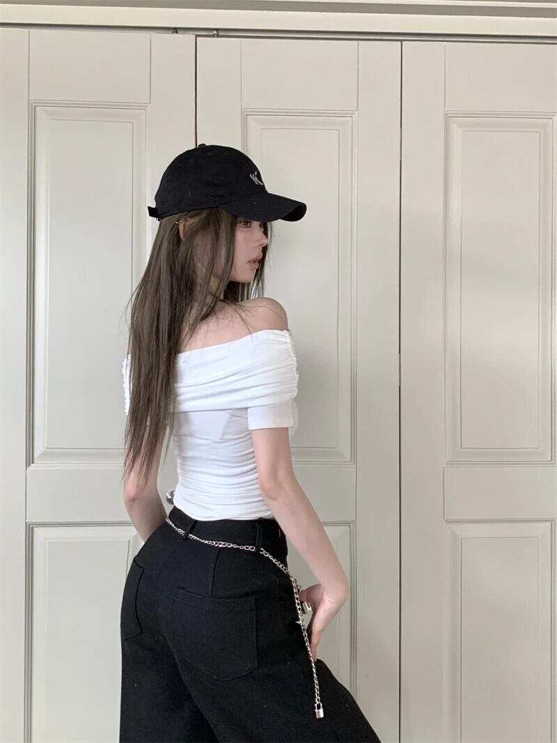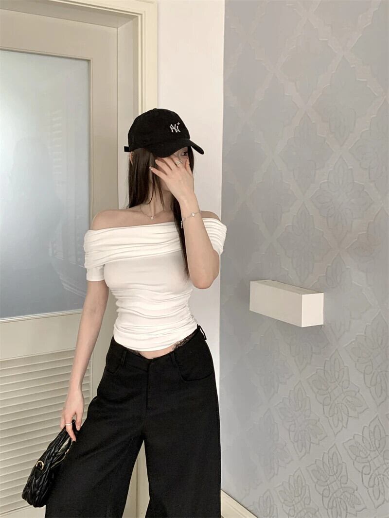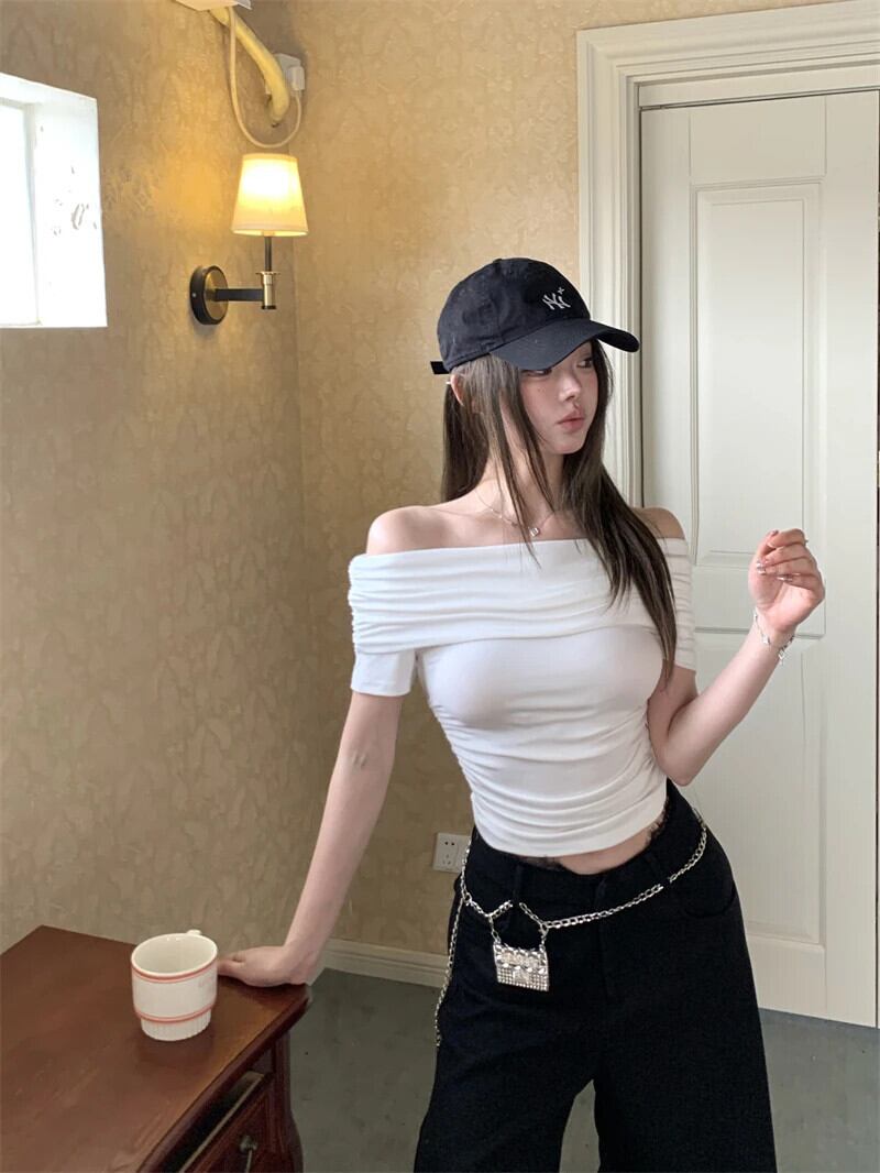 甘いホットガールセクシー黒オフショルダー半袖 Tシャツ夏タイトウエストショートスラッシュネックトップ ブラック 大人ガーリー スウィート キュート カジュアル サマー 夏物