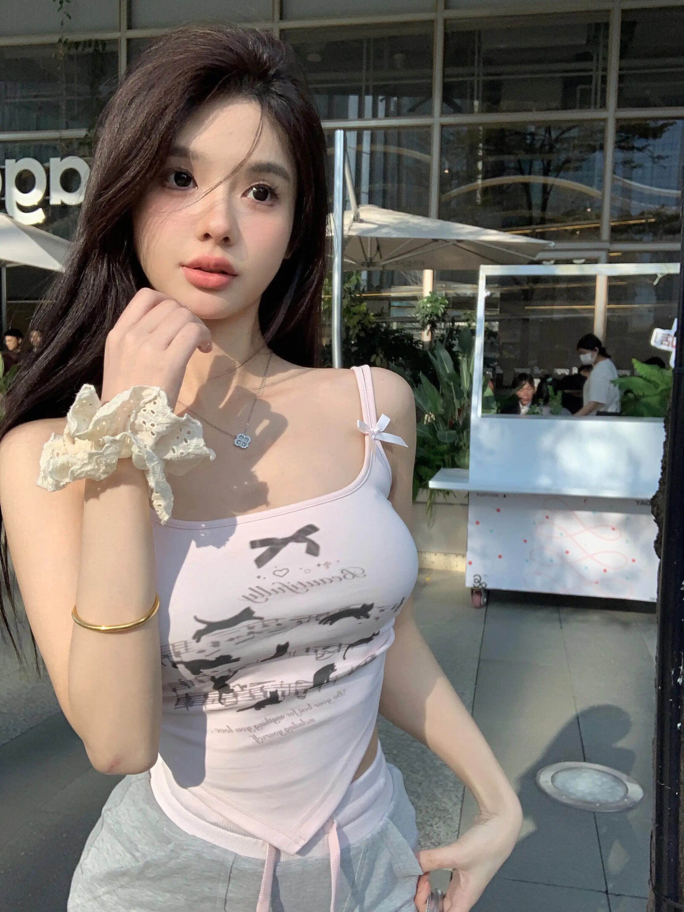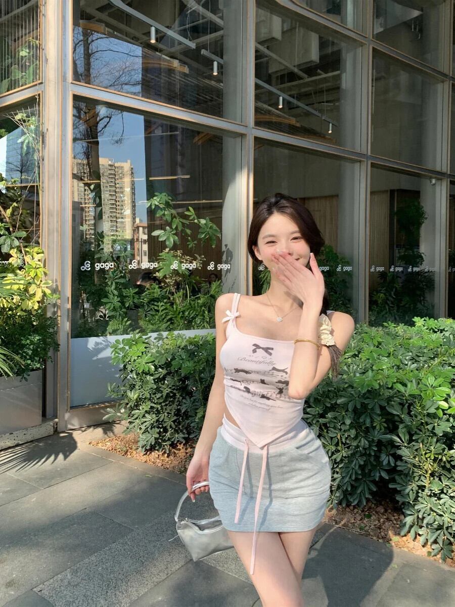 スイートホットガールスーツ夏不規則ボウストラップタンクトップラップヒップミニスカートツーピースセット リボン 大人ガーリー スウィート キュート カジュアル サマー 夏物