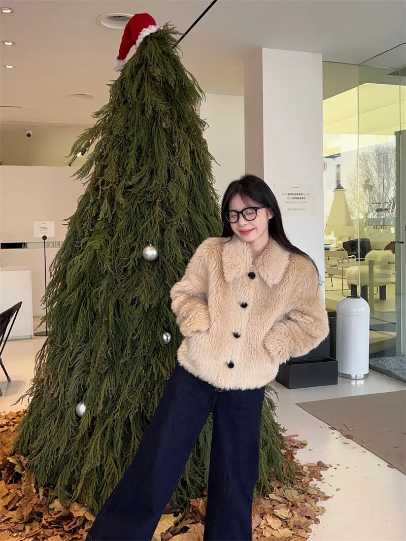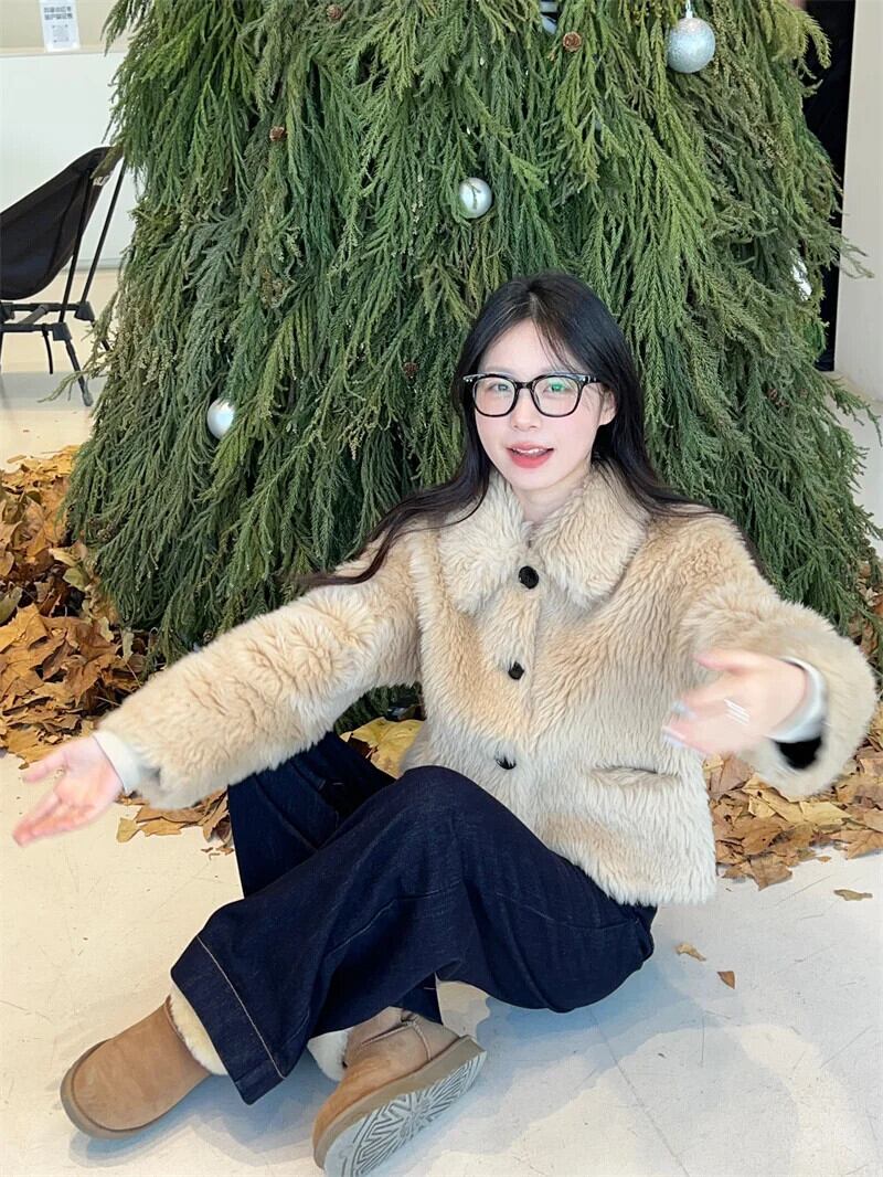 Sweet Girl ターンダウン襟ラムウールジャケット冬ルーズ長袖ぬいぐるみシングルブレストコート ロング 大人ガーリー スウィート キュート カジュアル ウィンター 冬物