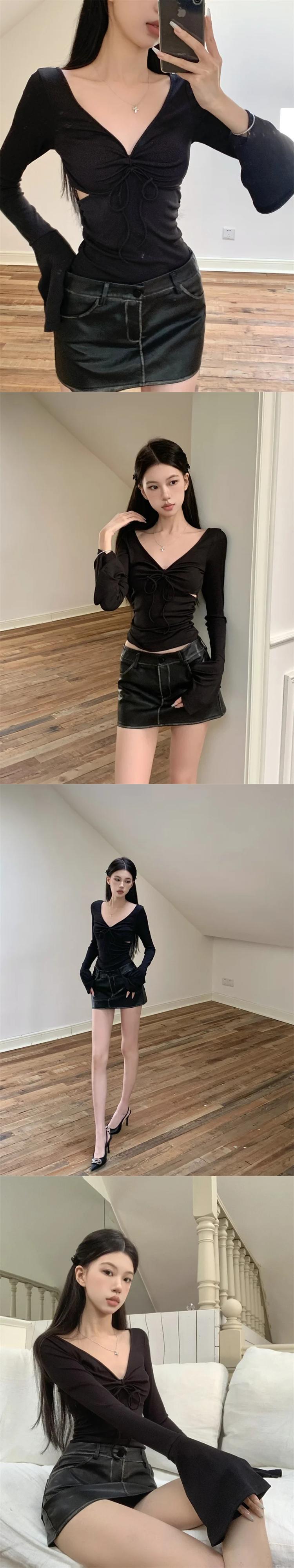 甘いホットガール V ネックレースアップフレアスリーブ Tシャツ春アウトニットショートトップ 大人ガーリー スウィート キュート カジュアル スプリング 春物 Vネック