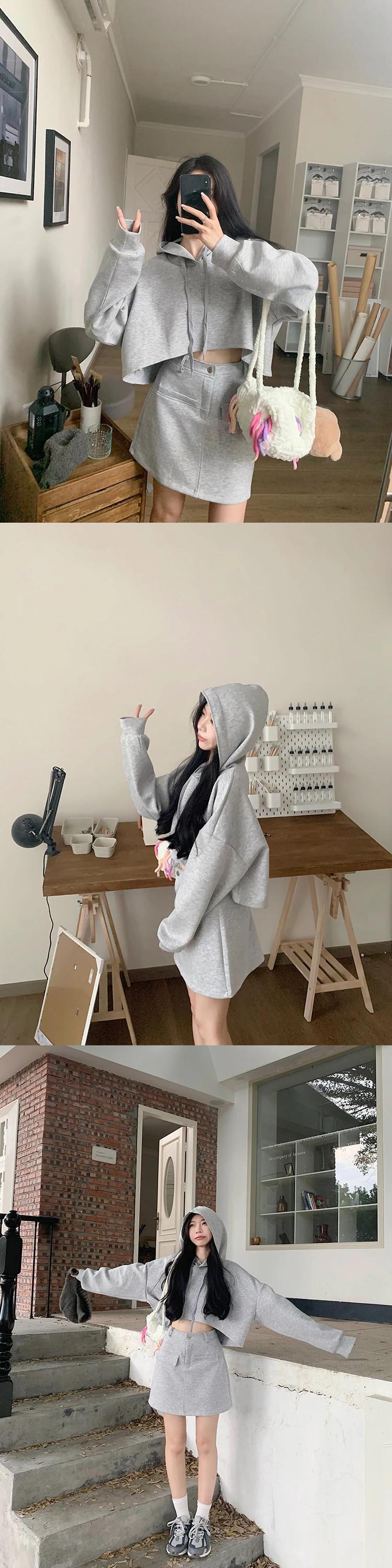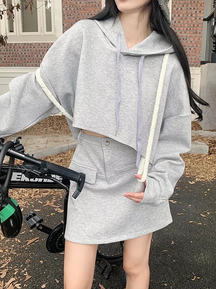 スイートホットガールスーツ レディース 春 ソリッドカラー フード付き ルーズ プルオーバー ウエスト Aライン ミニスカート 2点セット 大人ガーリー スウィート キュート カジュアル スプリング 春物