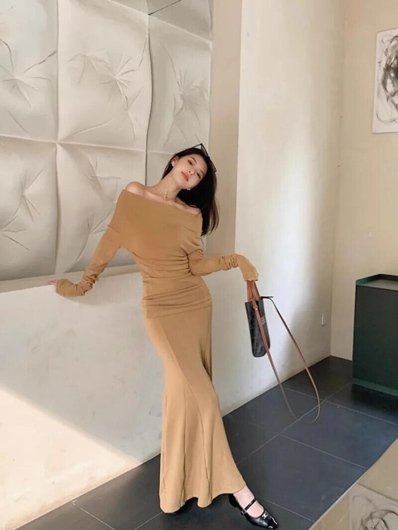 甘いホットガールスーツ春オフショルダースリムトップ弾性ウエストニットラップヒップマーメイドスカート 2 点セット エラスティック 伸縮 大人ガーリー スウィート キュート カジュアル スプリング 春物