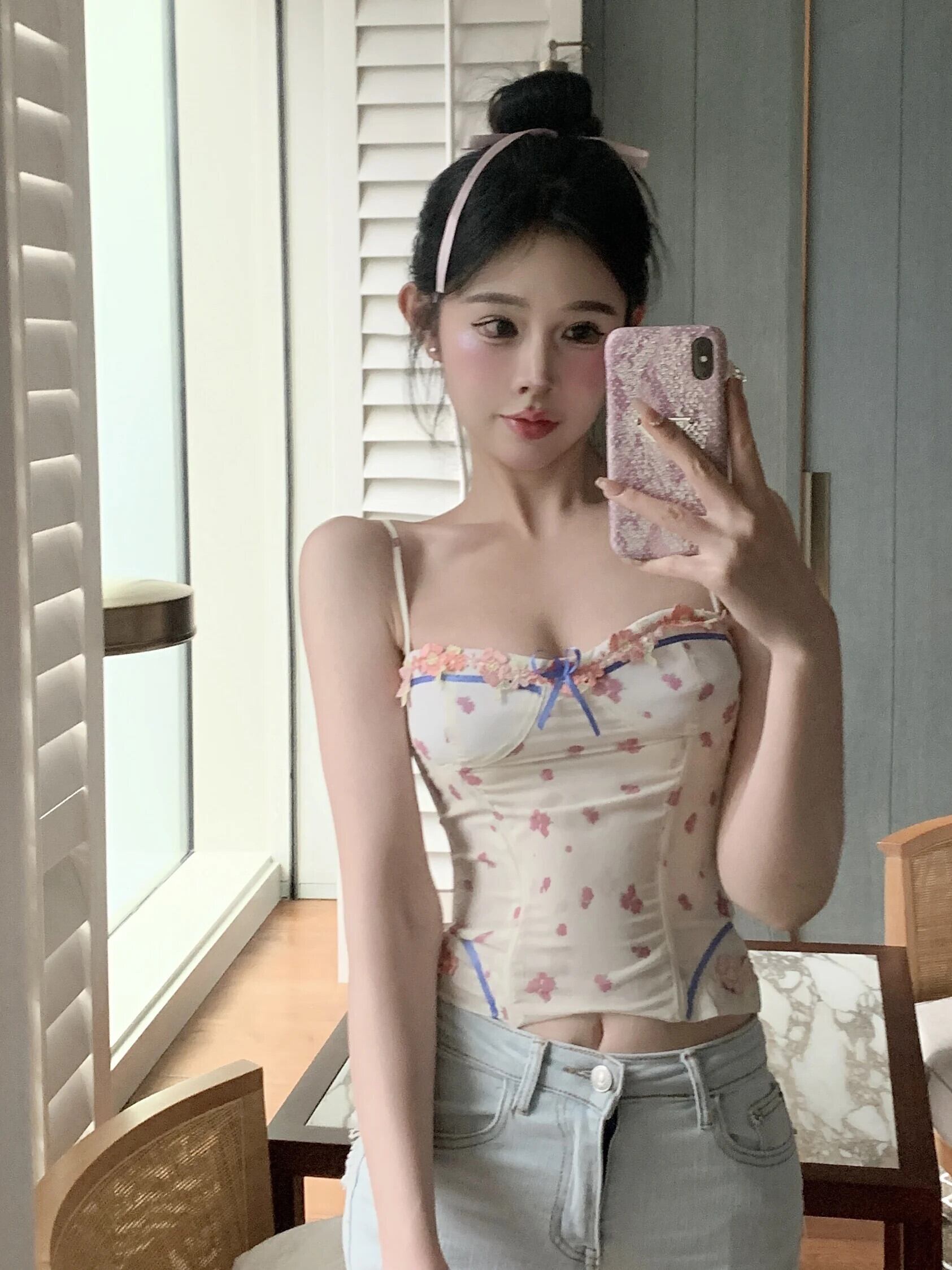 甘いホットガール純粋セクシー弓花ストラップトップ夏ノースリーブスリムフィットショートフィッシュボーンキャミソール リボン 大人ガーリー スウィート キュート カジュアル サマー 夏物 花柄 ピュア