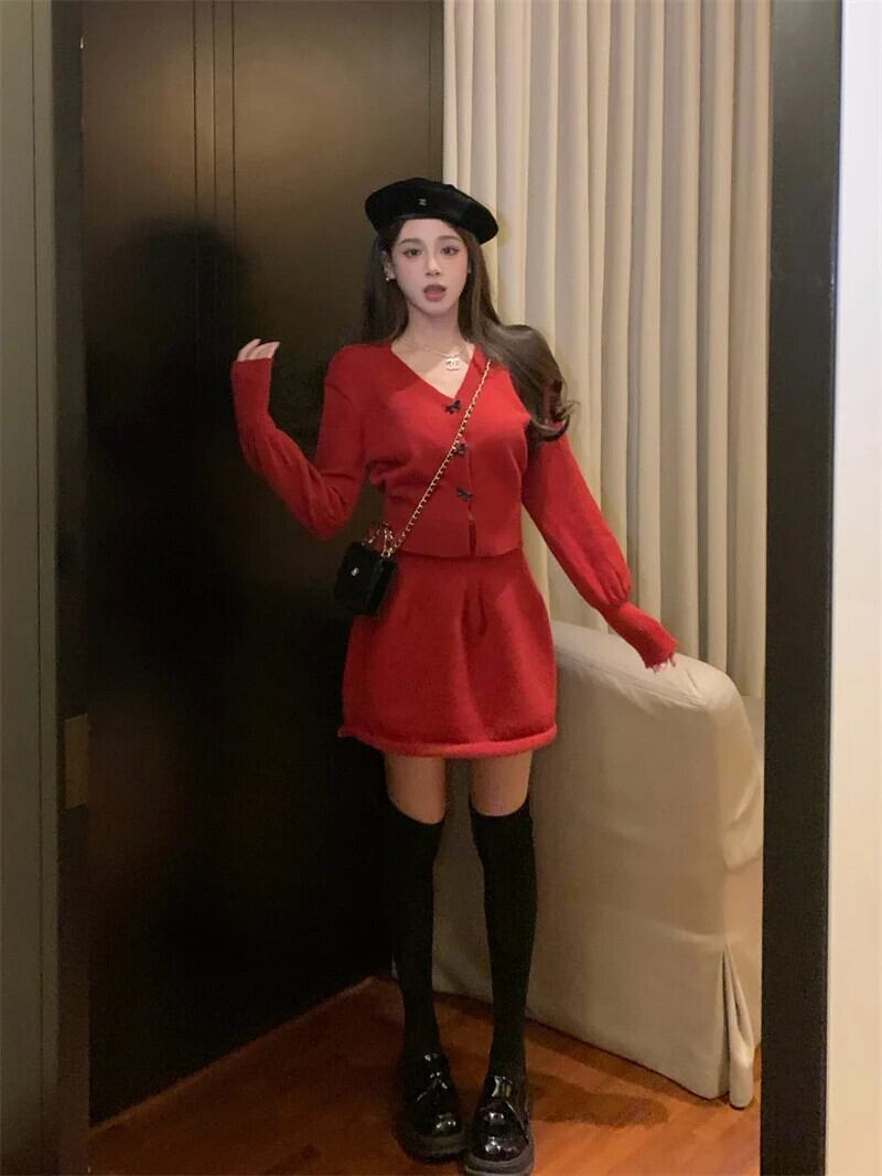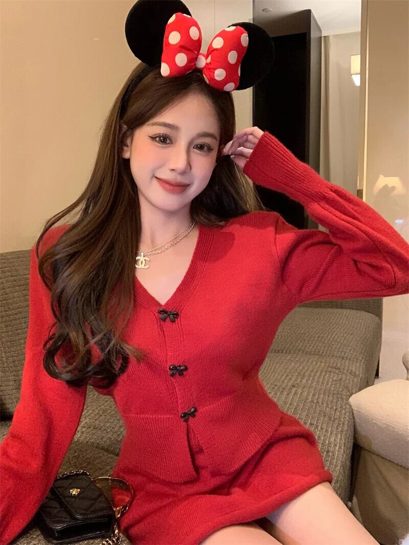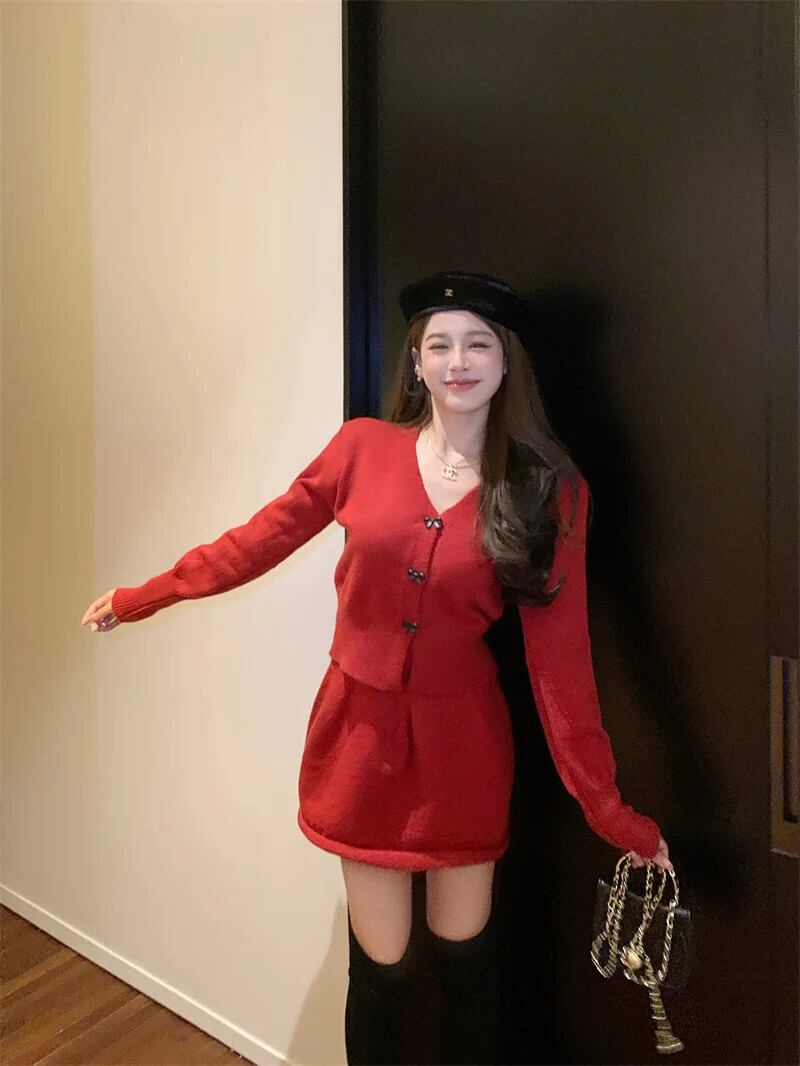 甘いホットガールニットスーツ春リボンニットカーディガンウエストミニスカートツーピースセット 大人ガーリー スウィート キュート カジュアル スプリング 春物