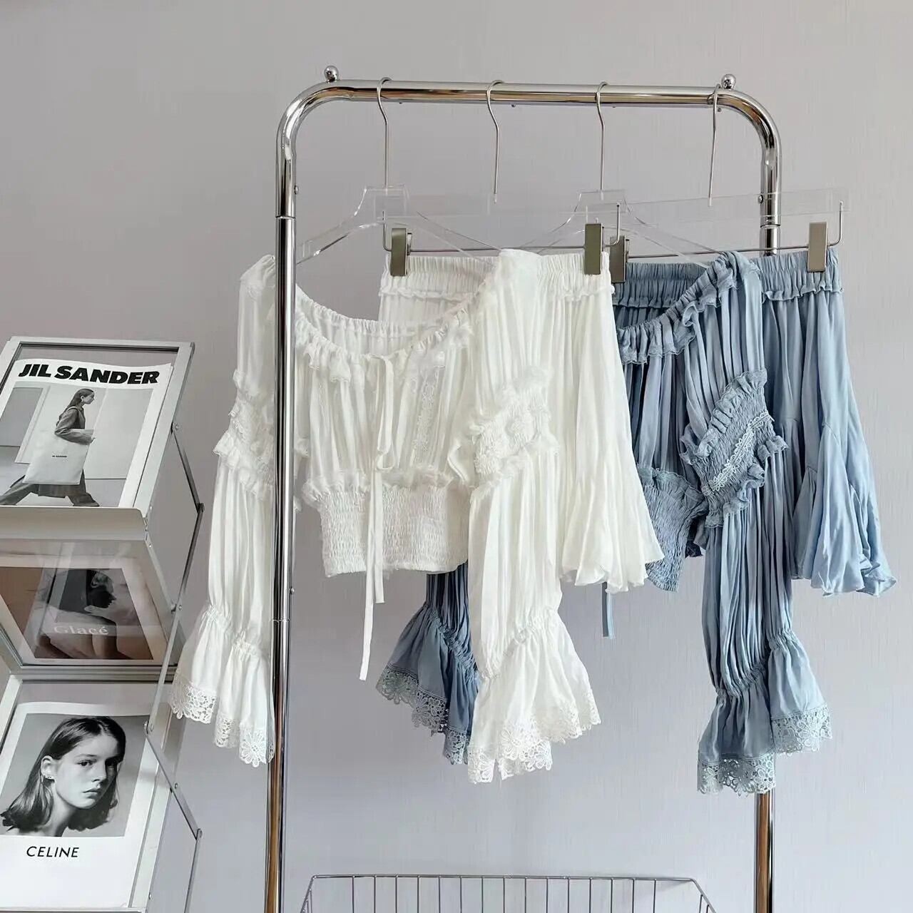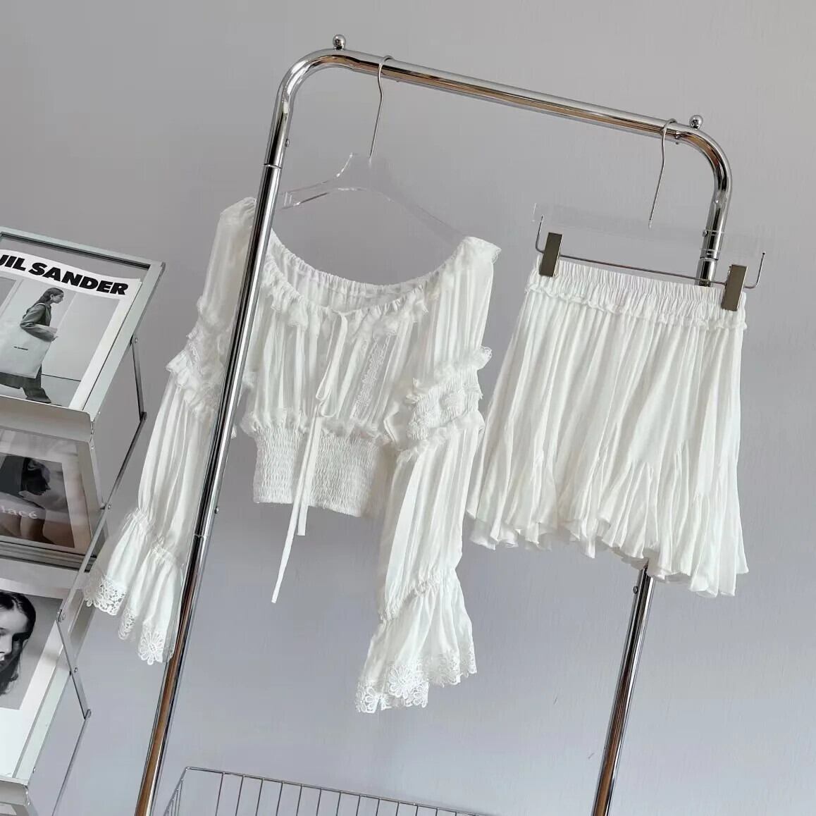 甘いホットガールレーススーツ夏オフショルダースリムフィットトップウエストスカートツーピースセット 大人ガーリー スウィート キュート カジュアル サマー 夏物