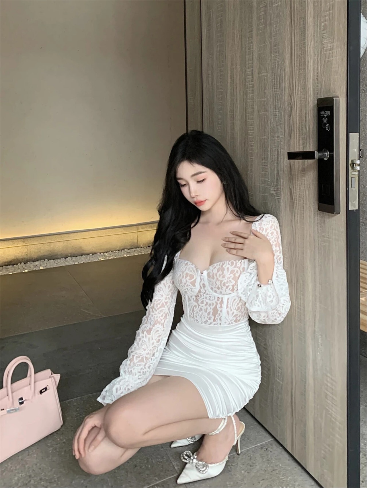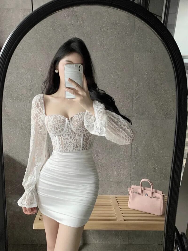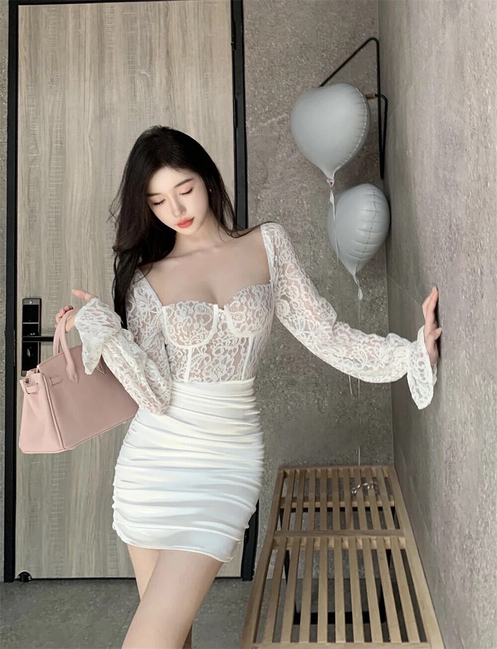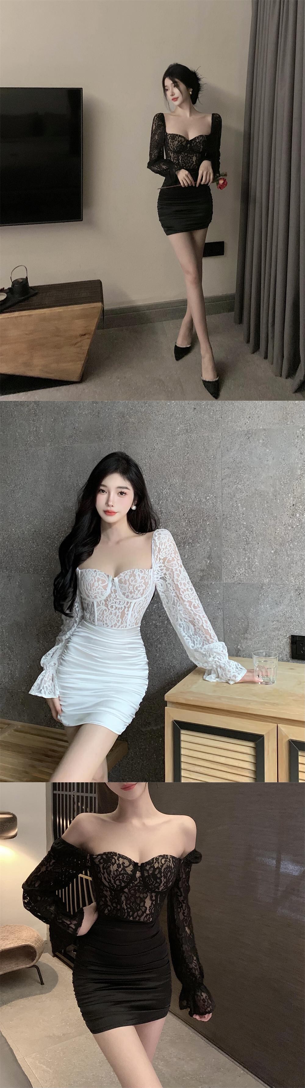 甘いホットガールスクエアカラーバブルスリーブドレス夏ウエストパッチワークレースラップ尻ショートドレス 大人ガーリー スウィート キュート カジュアル サマー 夏物 スクウェア
