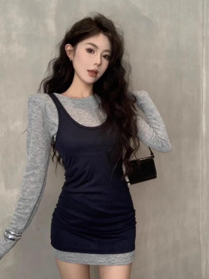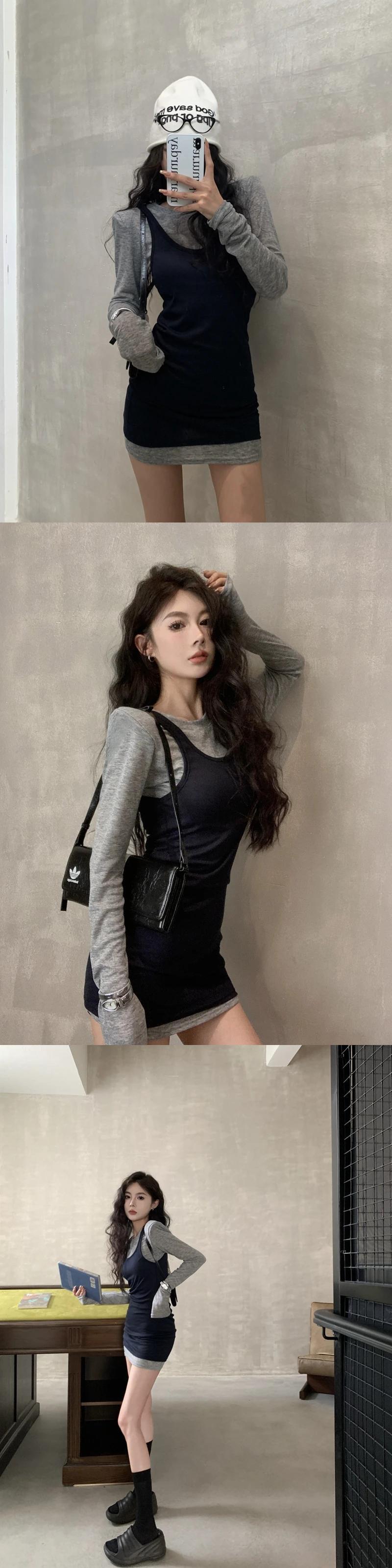 Sweet Hot Girl セット、レディース夏ソリッドカラー長袖 Tシャツミディアム丈ストラップトップ 2 点セット ロング 大人ガーリー スウィート キュート カジュアル サマー 夏物