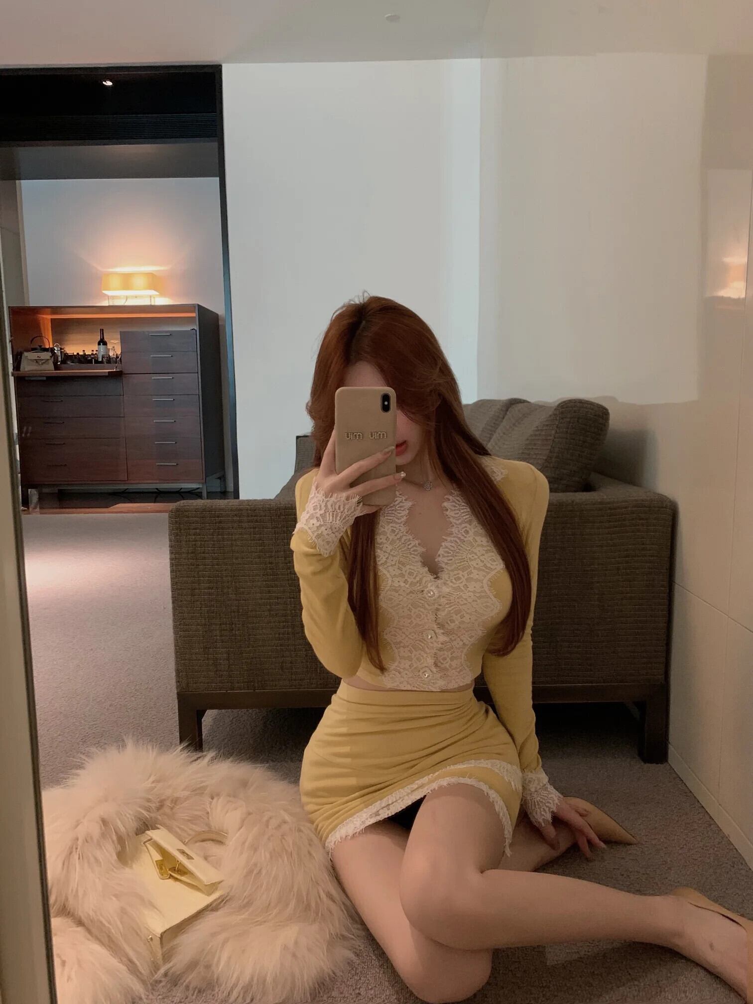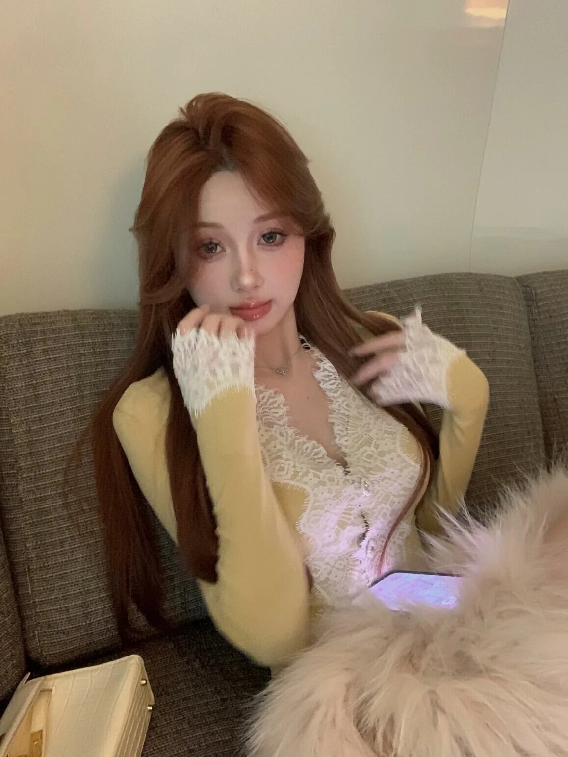 純粋セクシーホットガールスーツ春レースパッチワーク V ネックニットカーディガン尻ショートスカート 2 点セット スプリング 春物 Vネック