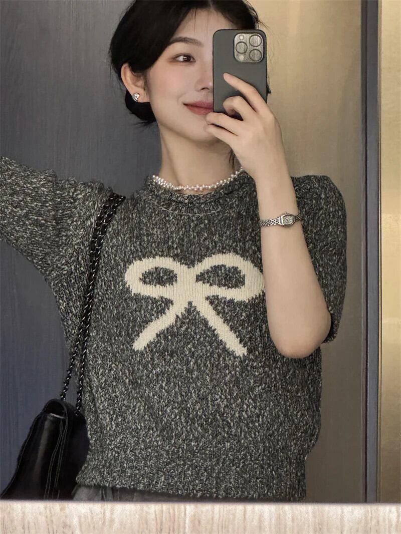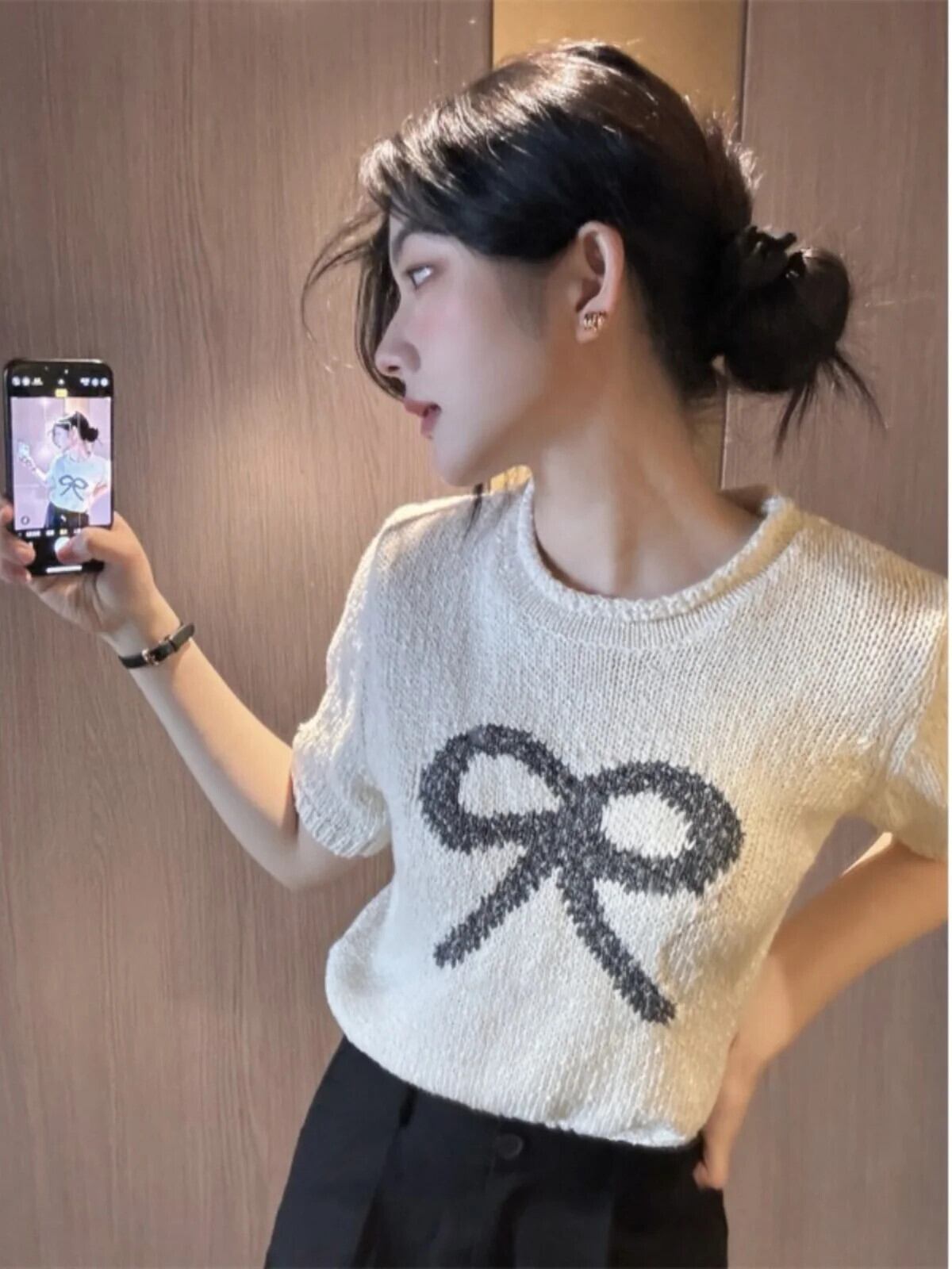 甘いホットガールレトロ弓ジャカード Tシャツ夏 O ネック半袖ルーズプルオーバートップ リボン 大人ガーリー スウィート キュート カジュアル サマー 夏物 Oネック
