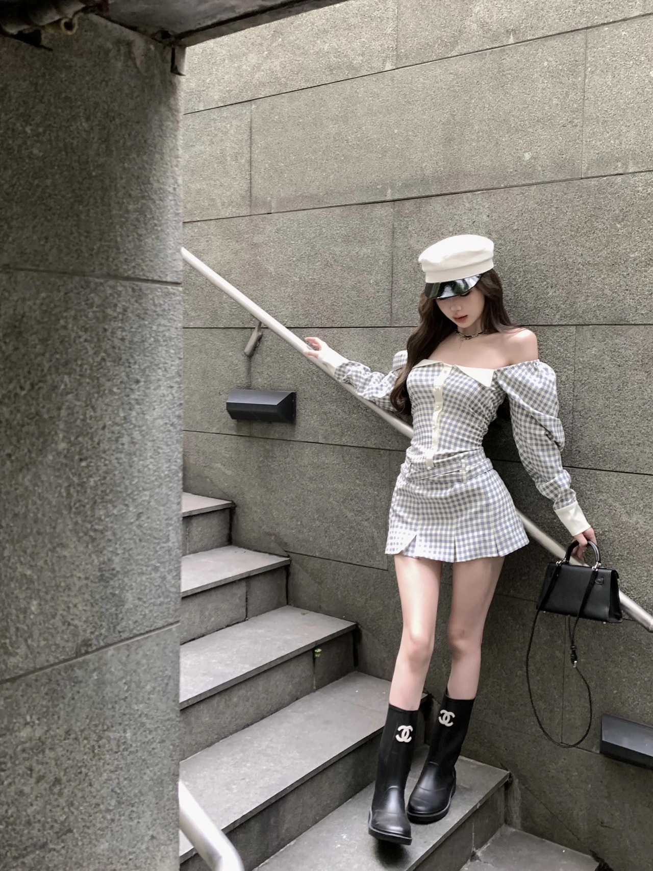 甘いホットガールブルーチェック柄ドレス春スクエアカラー長袖スリムフィットラップヒップ A ラインショートドレス ロング 大人ガーリー スウィート キュート カジュアル スプリング 春物 Aライン スクウェア