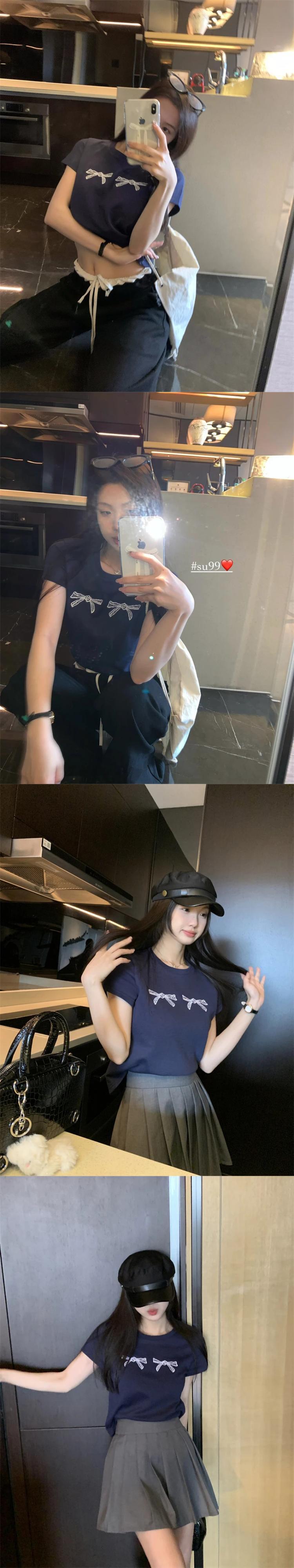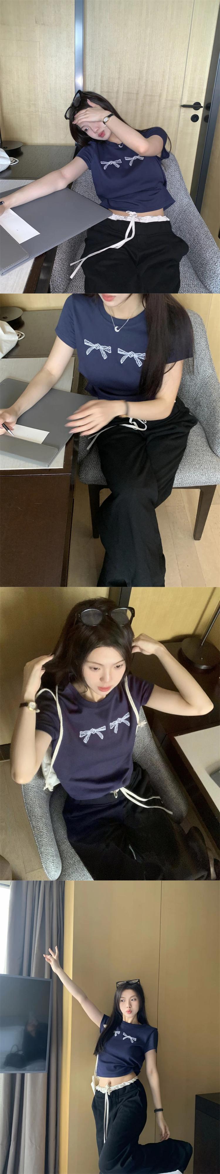 甘いホットガール蝶刺繍 Tシャツ春スリム半袖 O ネックショートトップ レッド 大人ガーリー スウィート キュート カジュアル スプリング 春物 Oネック