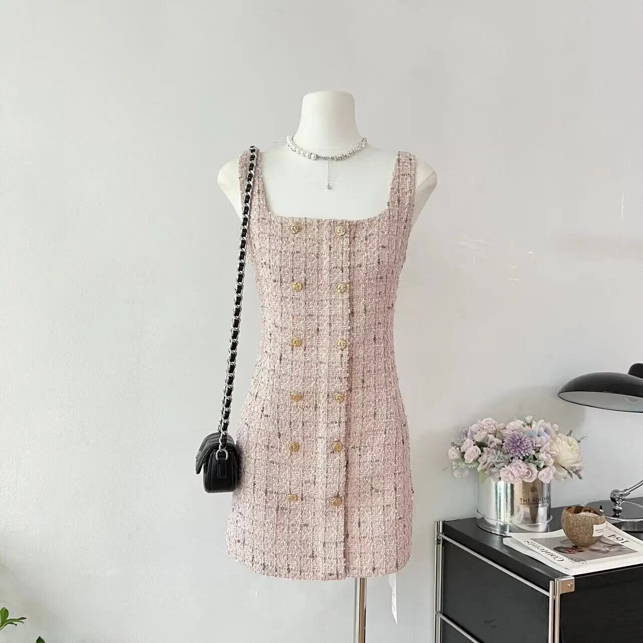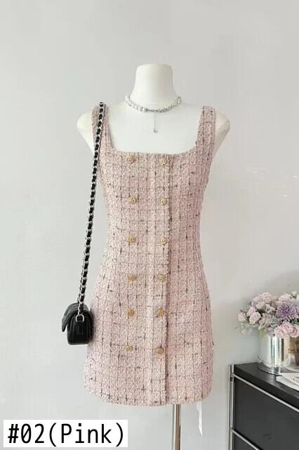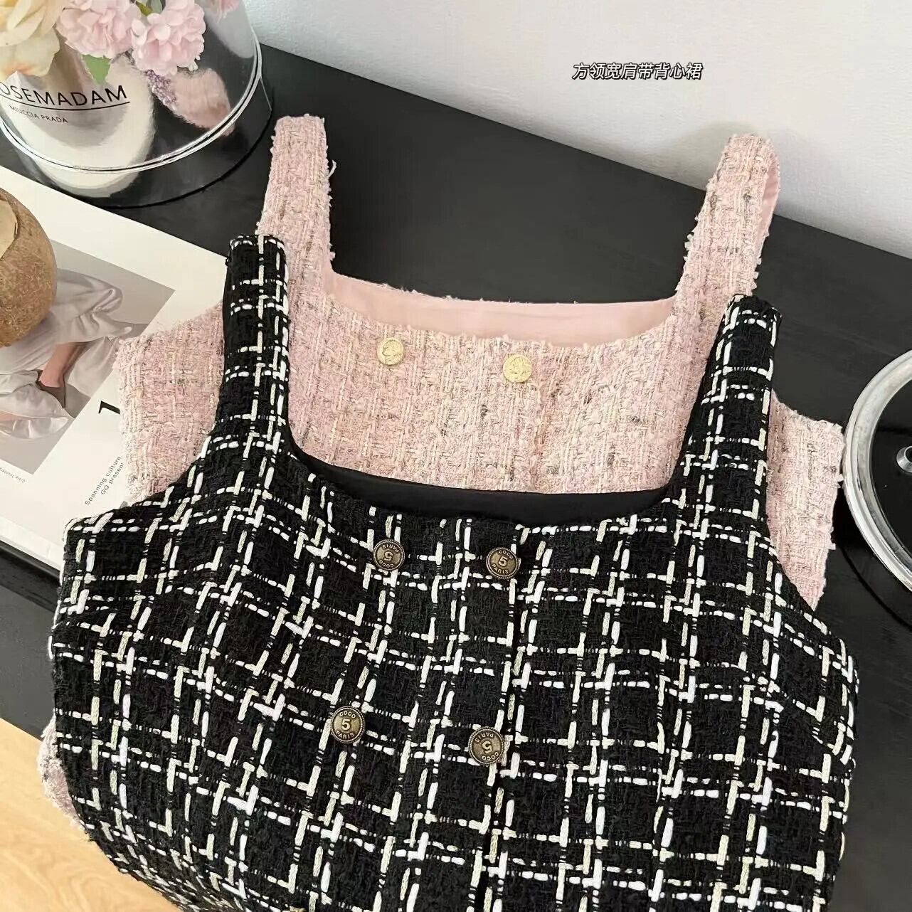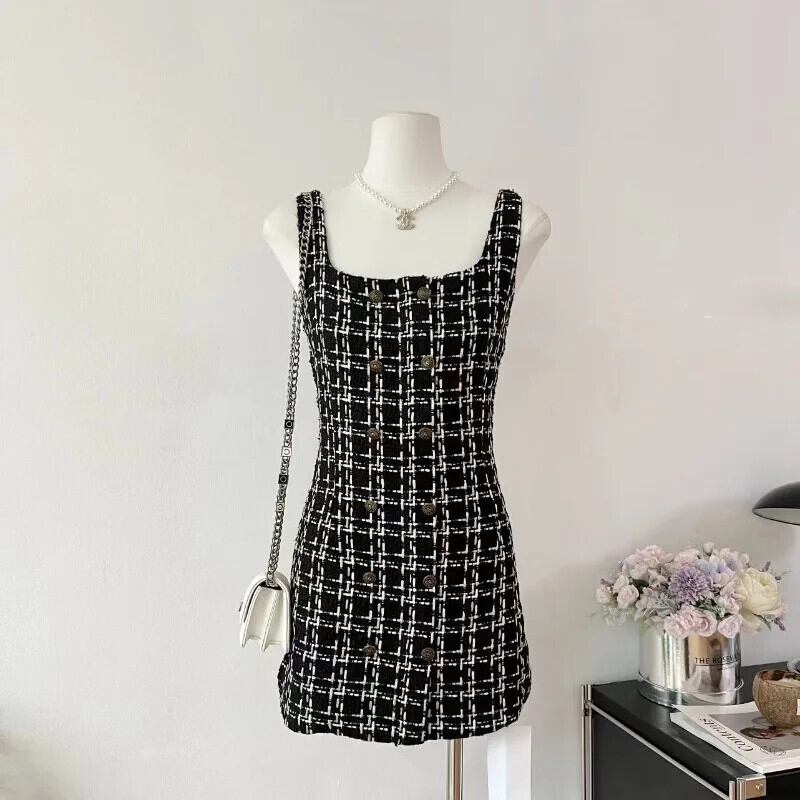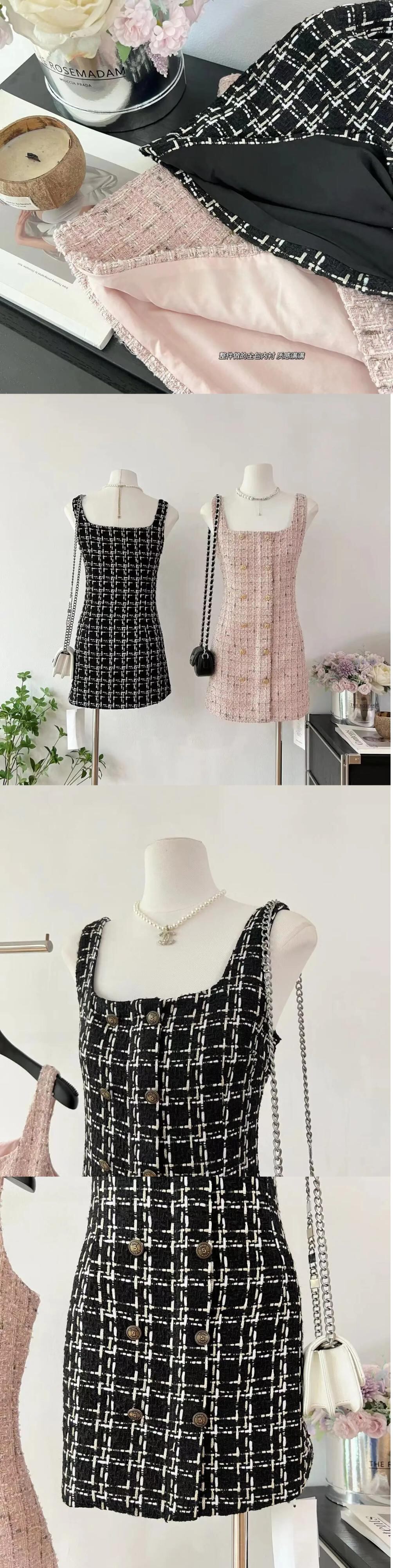 甘いホットガールツイードストラップドレス春/夏セクシースクエアカラースリムフィットチェック柄ショートドレス 大人ガーリー スウィート キュート カジュアル スプリング 春物 サマー 夏物 スクウェア