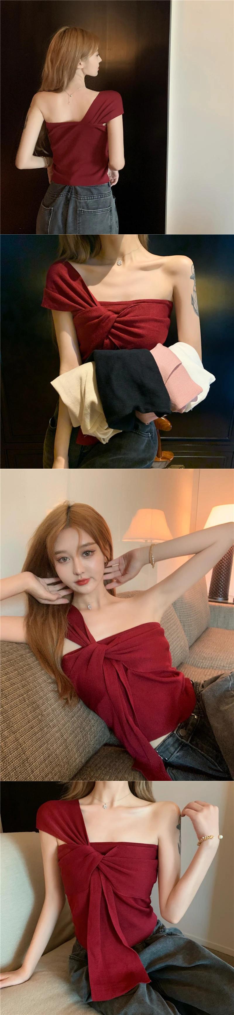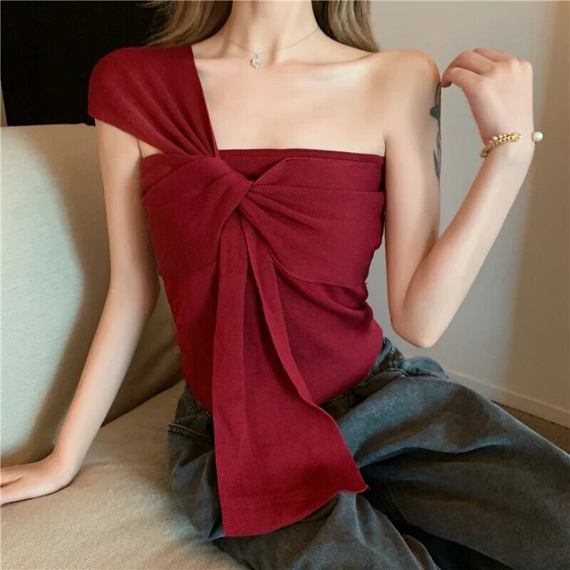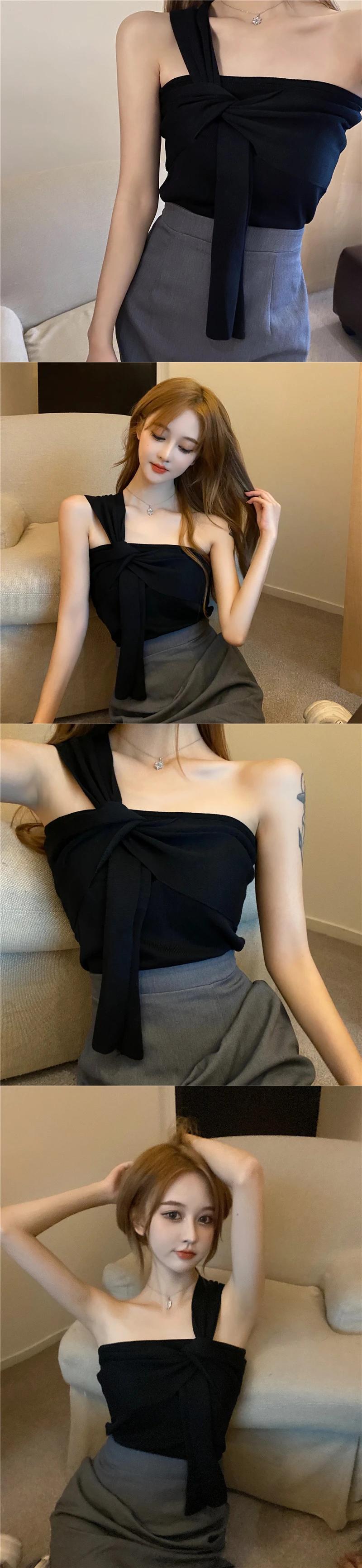 甘いホットガール斜めショルダータンクトップ春/夏セクシーストラップショートニットトップ 大人ガーリー スウィート キュート カジュアル スプリング 春物 サマー 夏物