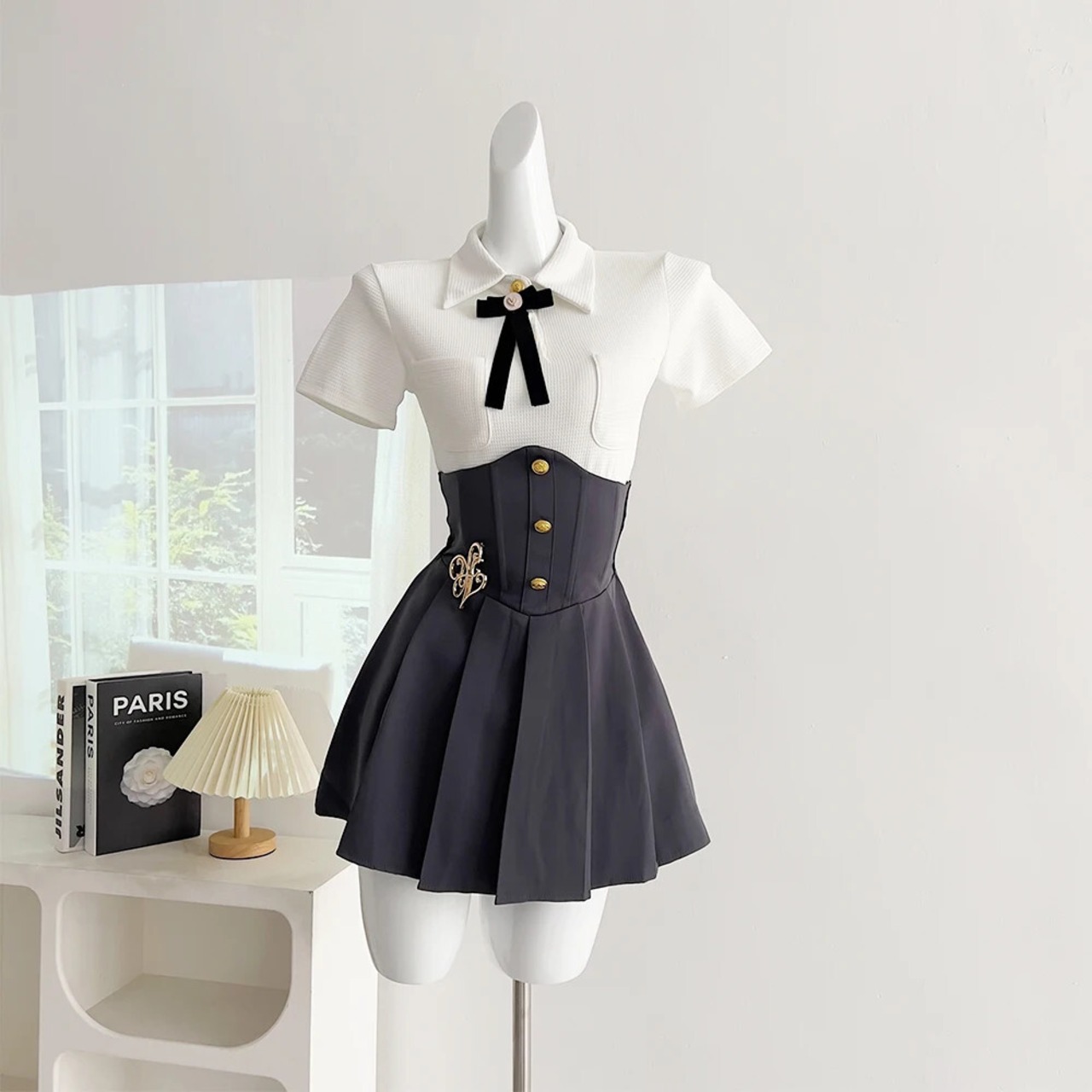 甘いホットガールプレッピースタイルスーツ夏フィッシュボーンスリムフィット弾性ドレス半袖 Tシャツ 2 点セット エラスティック 伸縮 大人ガーリー スウィート キュート カジュアル サマー 夏物