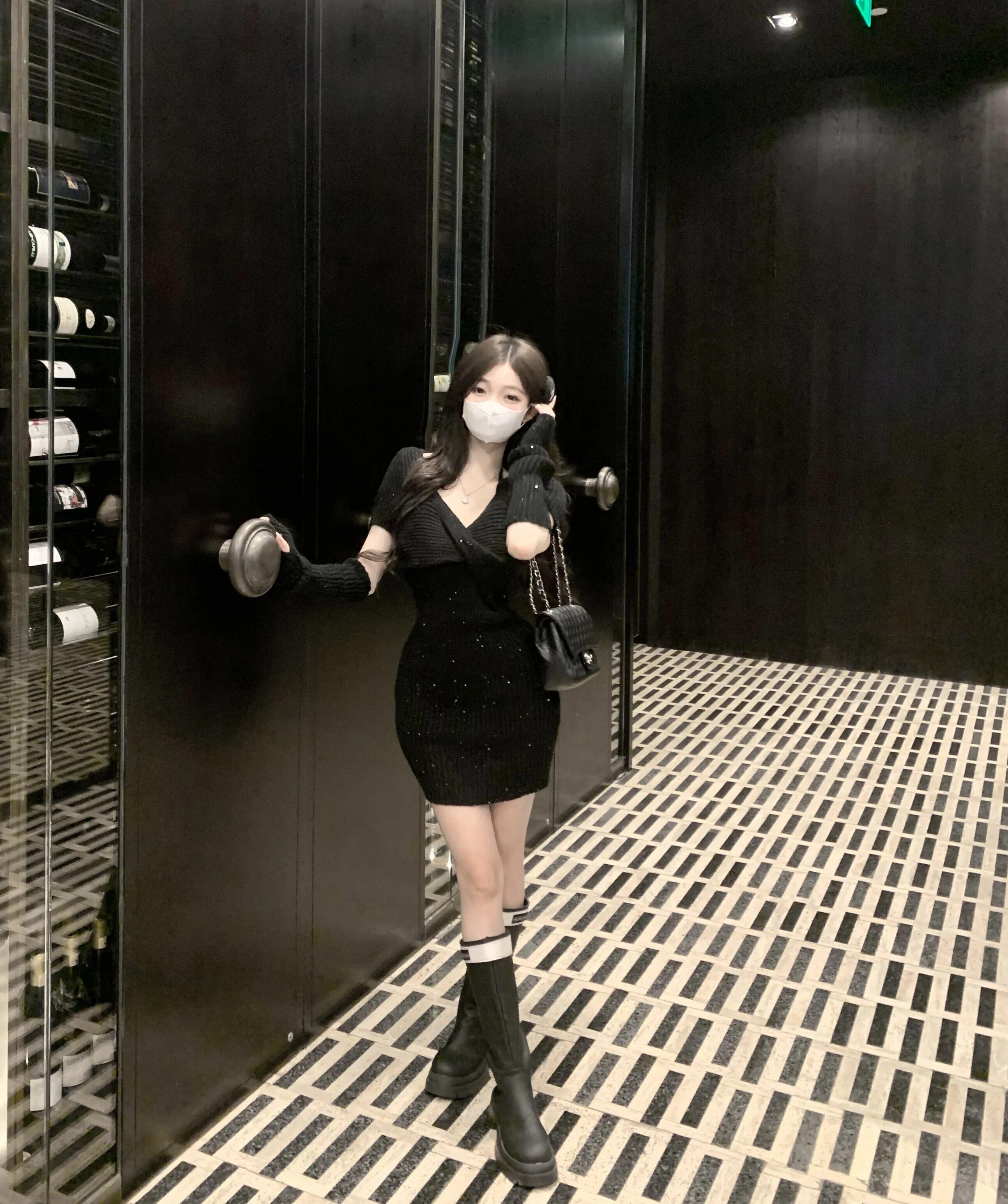 甘いホットガールツイスト V ネックブラックドレス冬スリムフィット袖尻ラップショートドレス 大人ガーリー スウィート キュート カジュアル ウィンター 冬物 Vネック