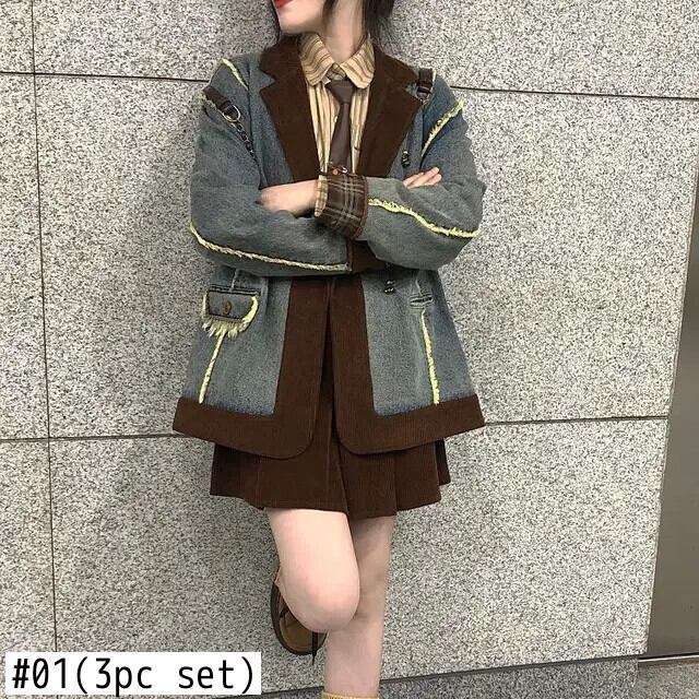 ホットガールレトロスーツ秋コーデュロイデニムコートストライプシャツウエストスカート 3 点セットファッション オータム 秋物