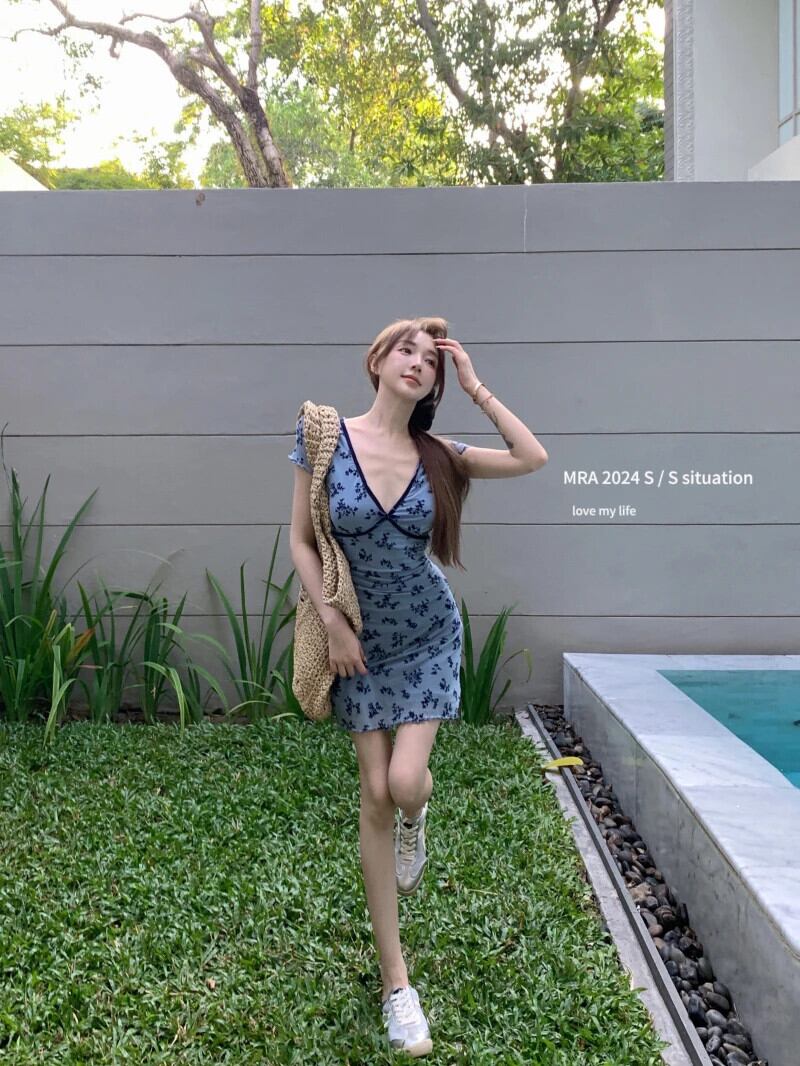 ホットガール純粋セクシーレトロ V ネック花柄半袖ドレス夏スリムフィットヒップラップ A ラインショートドレス サマー 夏物 Vネック Aライン ピュア