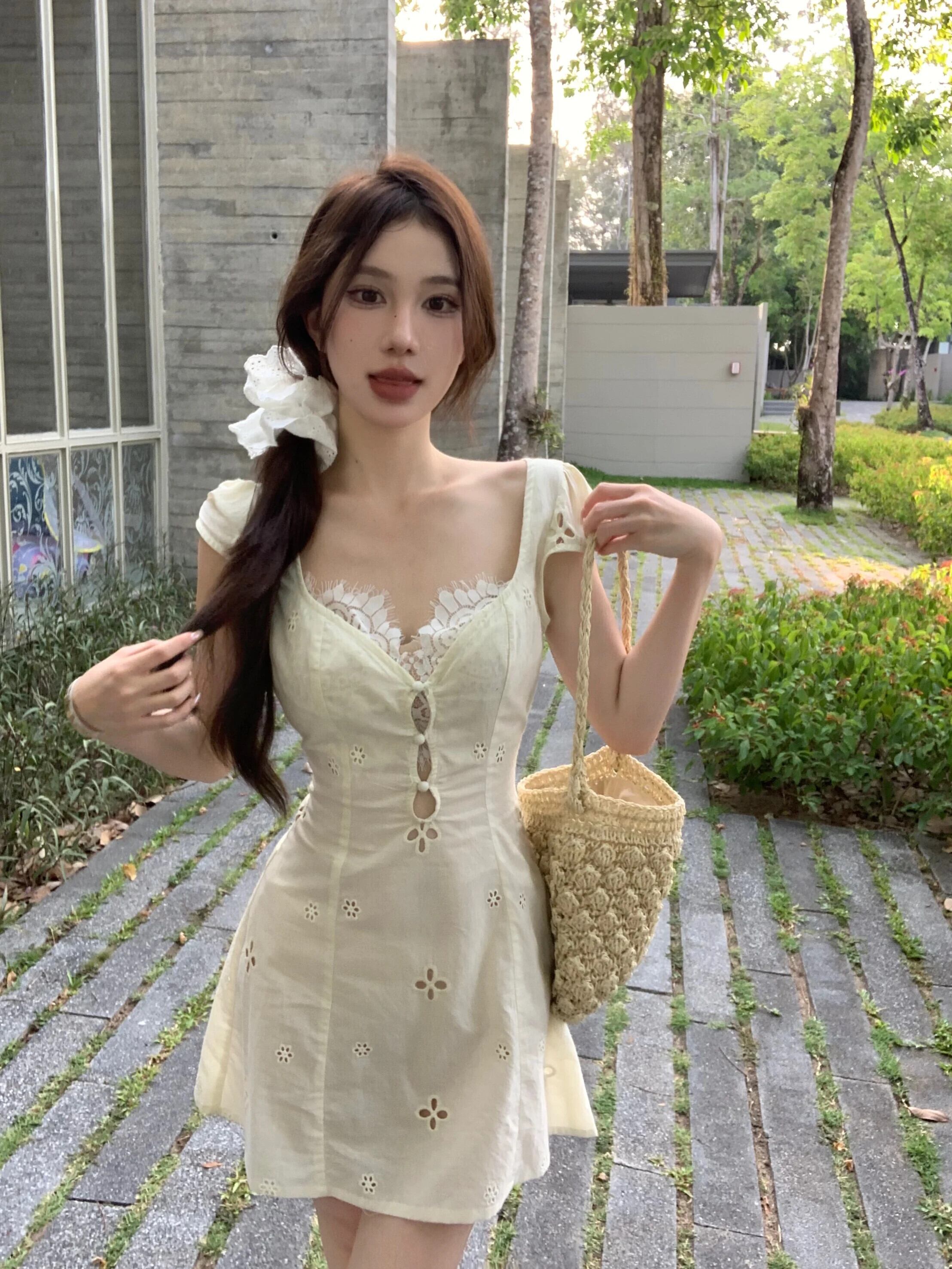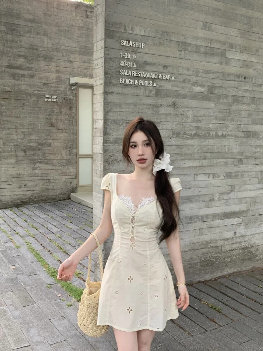 フレンチスイートホットガールスクエアカラードレス春純粋セクシーアウトAラインショートドレス 大人ガーリー スウィート キュート カジュアル スプリング 春物 ピュア スクウェア