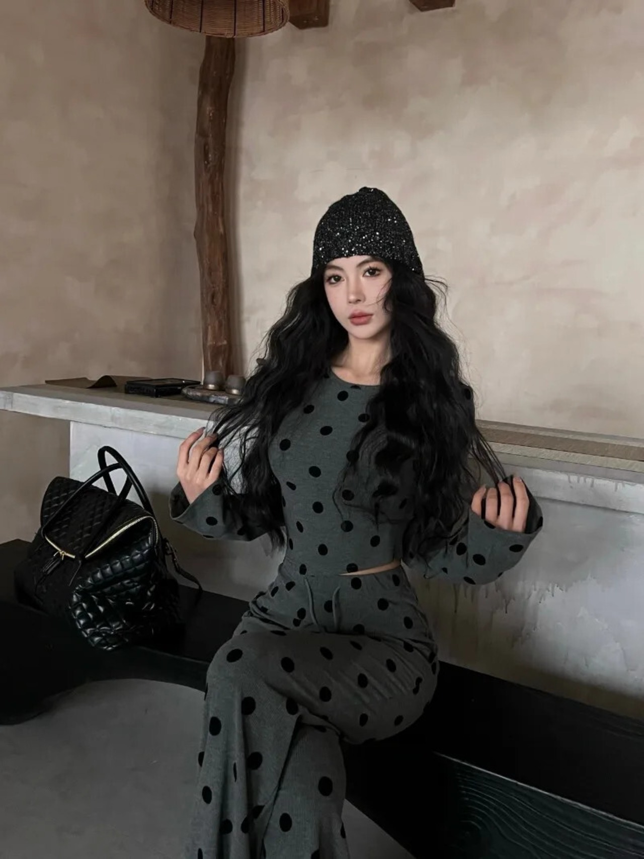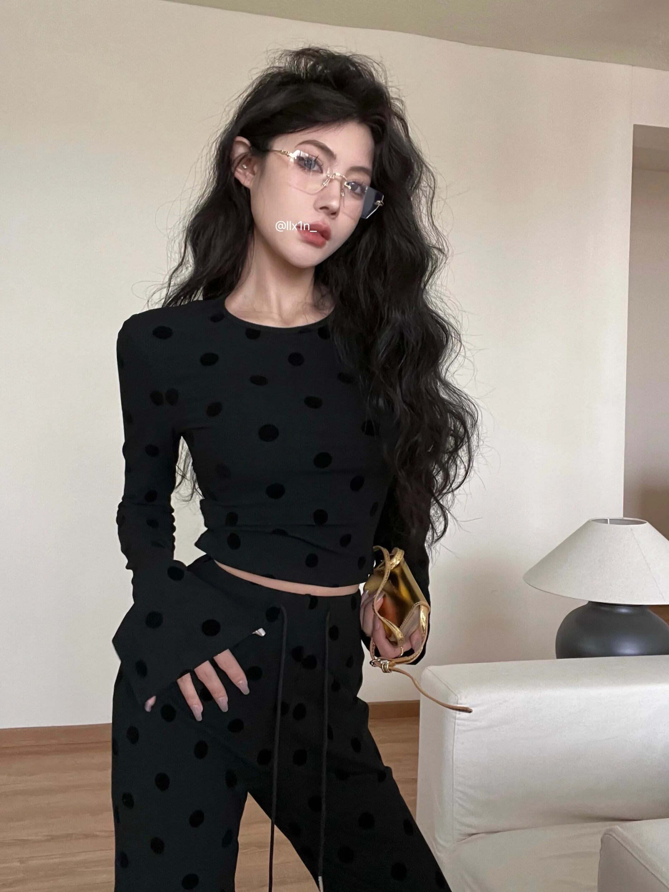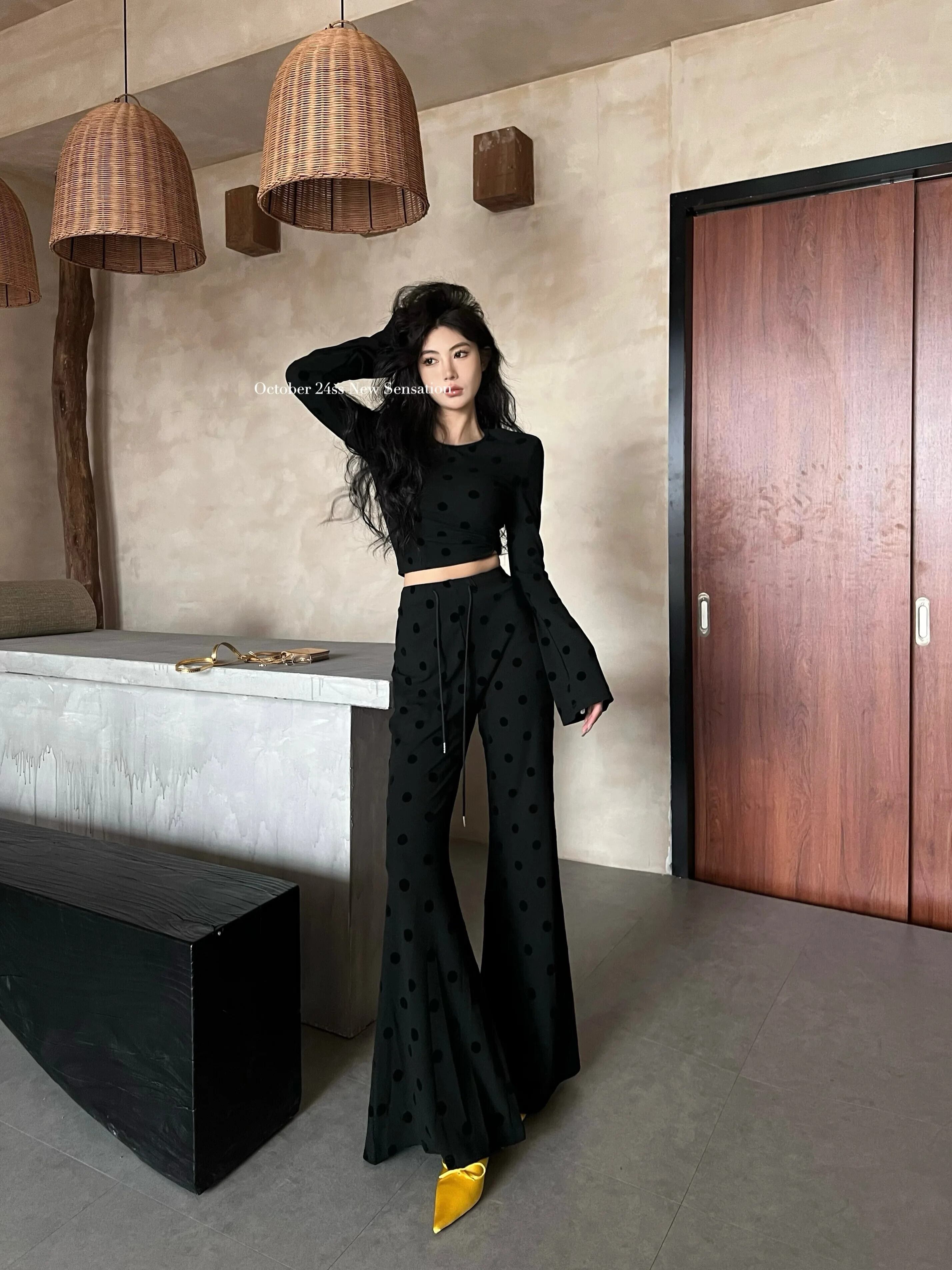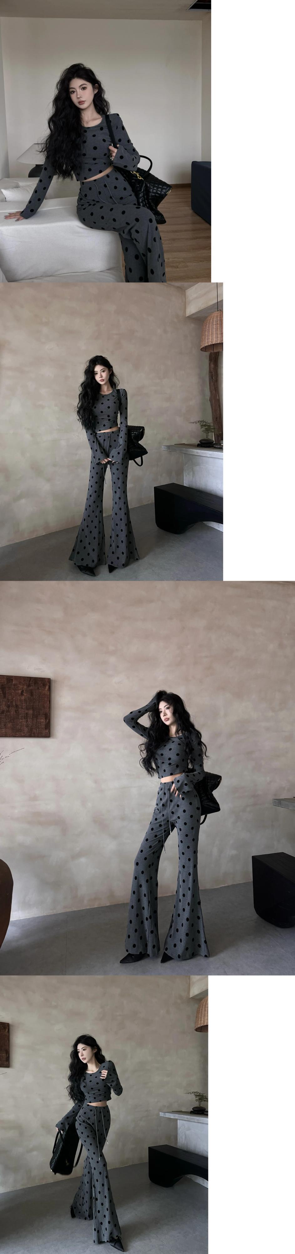 甘いホットガールスーツ春 O ネック長袖 Tシャツトップ水玉フレアパンツ 2 点セット ロング レッド 大人ガーリー スウィート キュート カジュアル スプリング 春物 Oネック