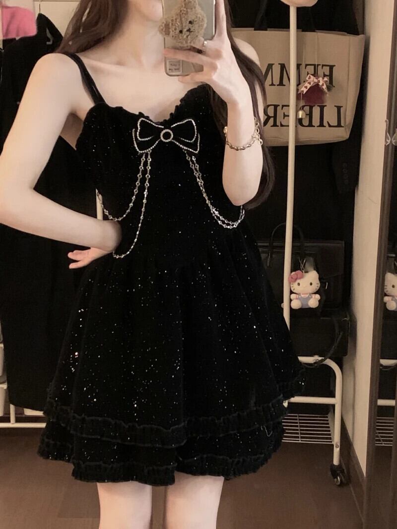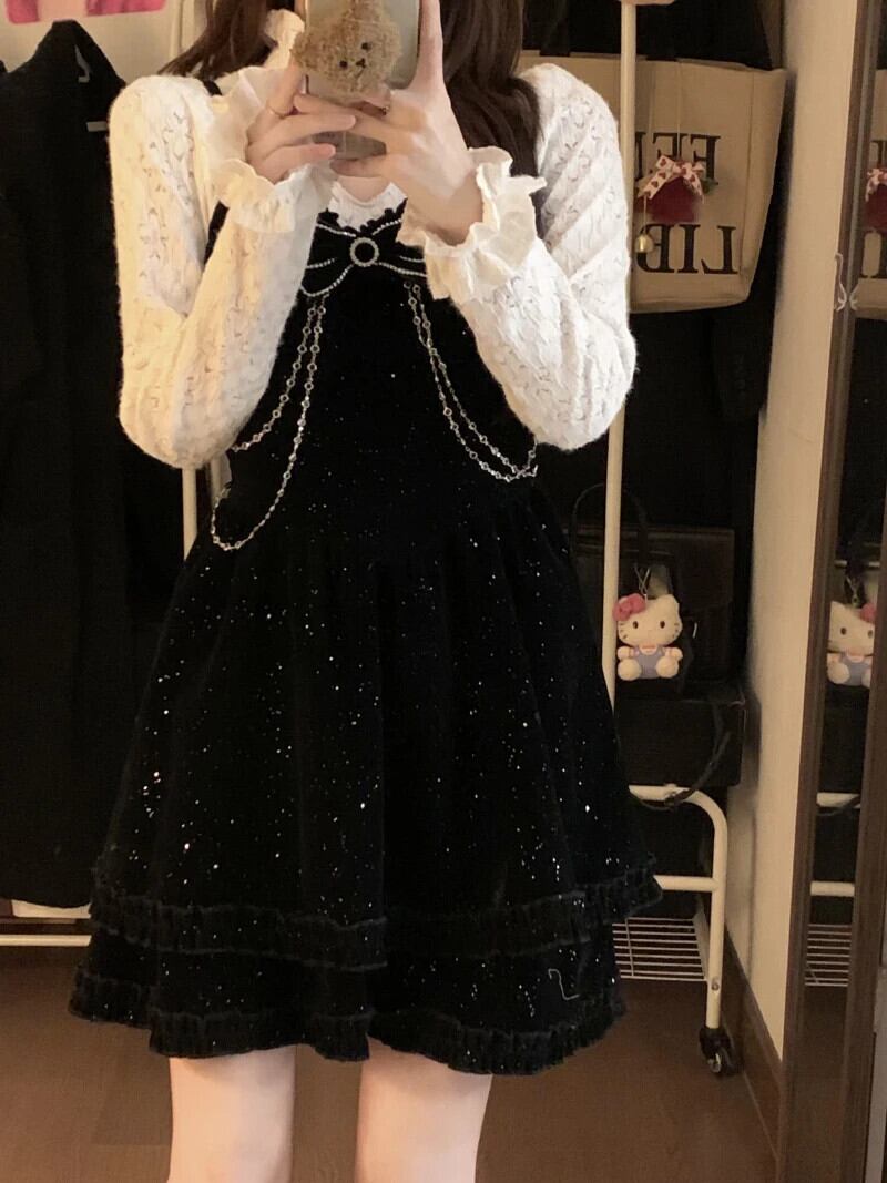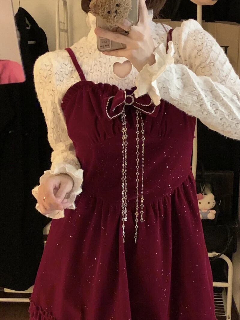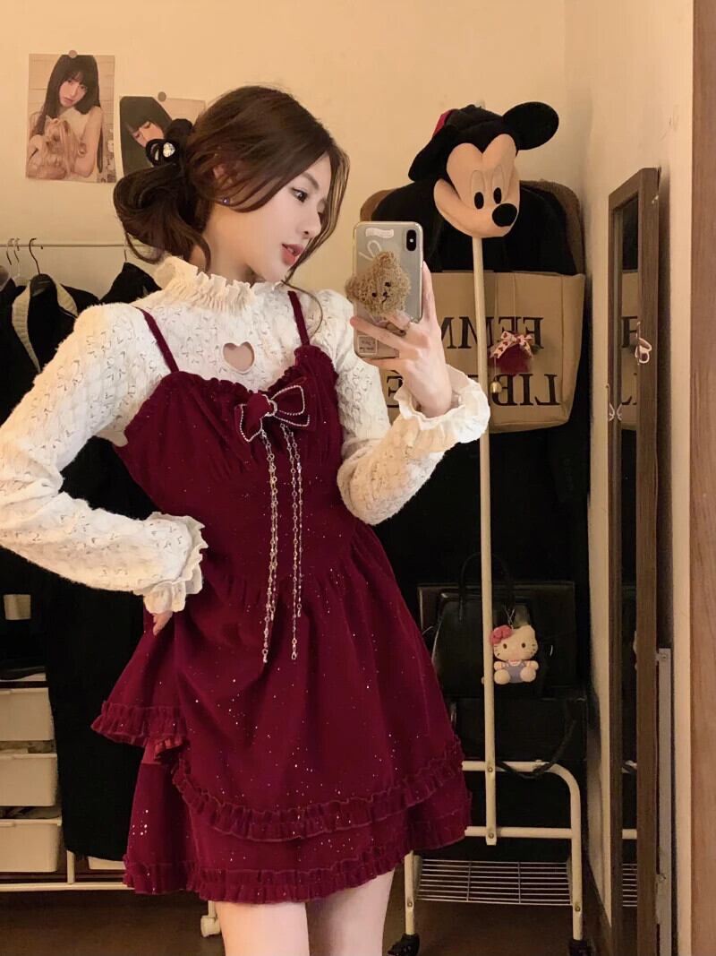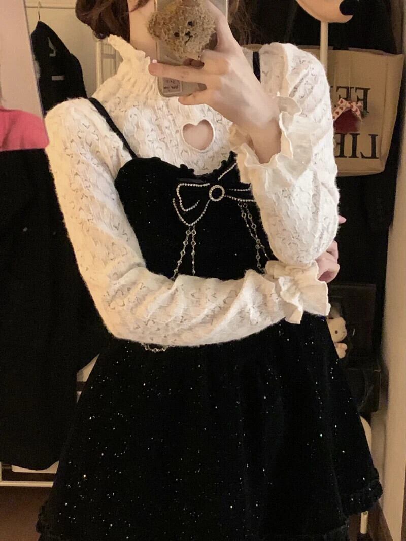 甘いホットガールスーツ秋/冬アウトハーフネックレースシャツ A ラインストラップドレス 2 点セット 大人ガーリー スウィート キュート カジュアル オータム 秋物 ウィンター 冬物 Aライン