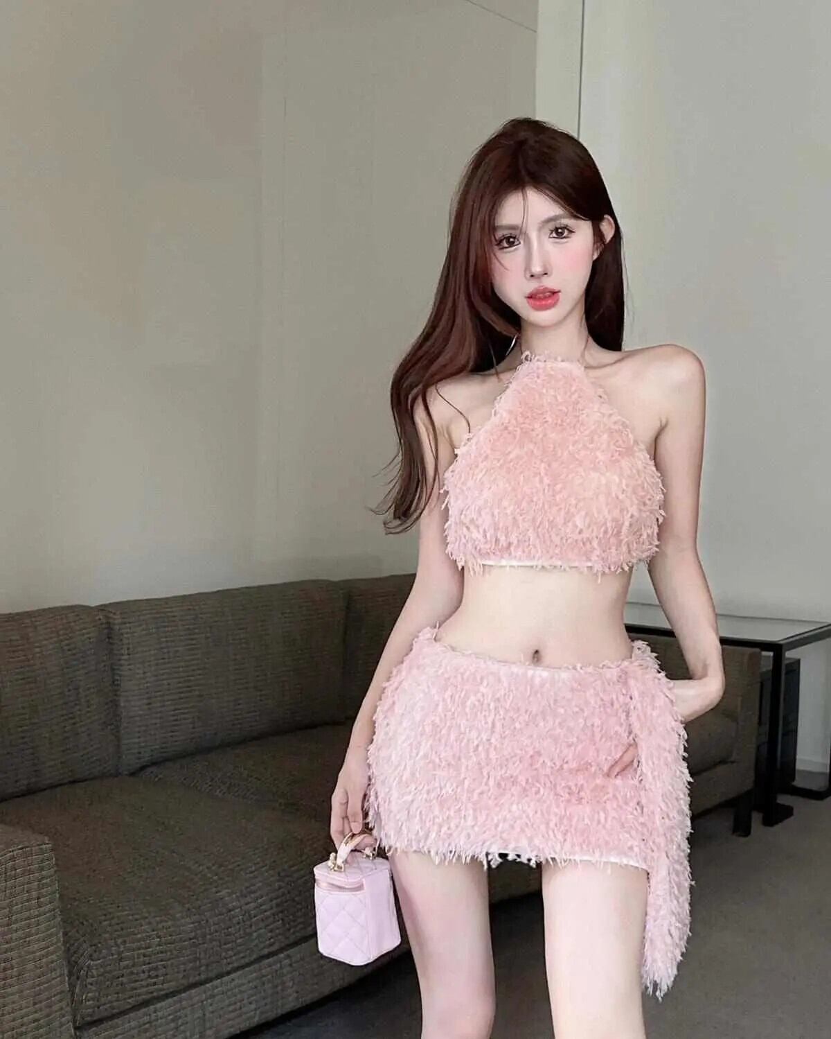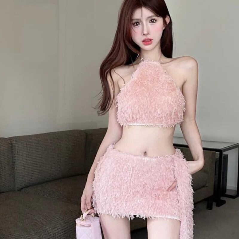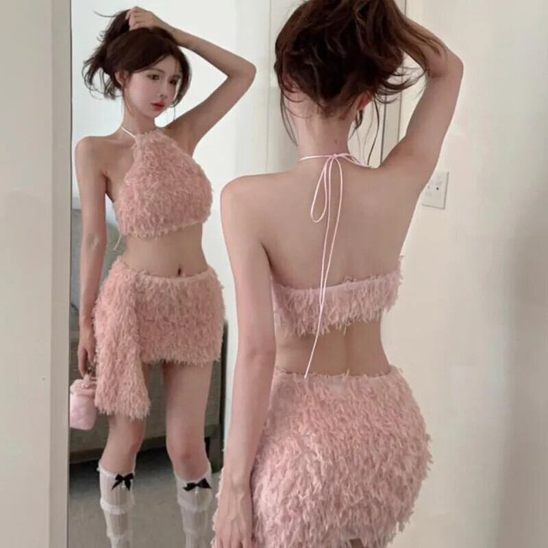 甘いホットガールセクシーぬいぐるみスーツ春/夏背中開いた豪華ホルターネックベスト尻ラップショートスカート 2 点セット 大人ガーリー スウィート キュート カジュアル スプリング 春物 サマー 夏物