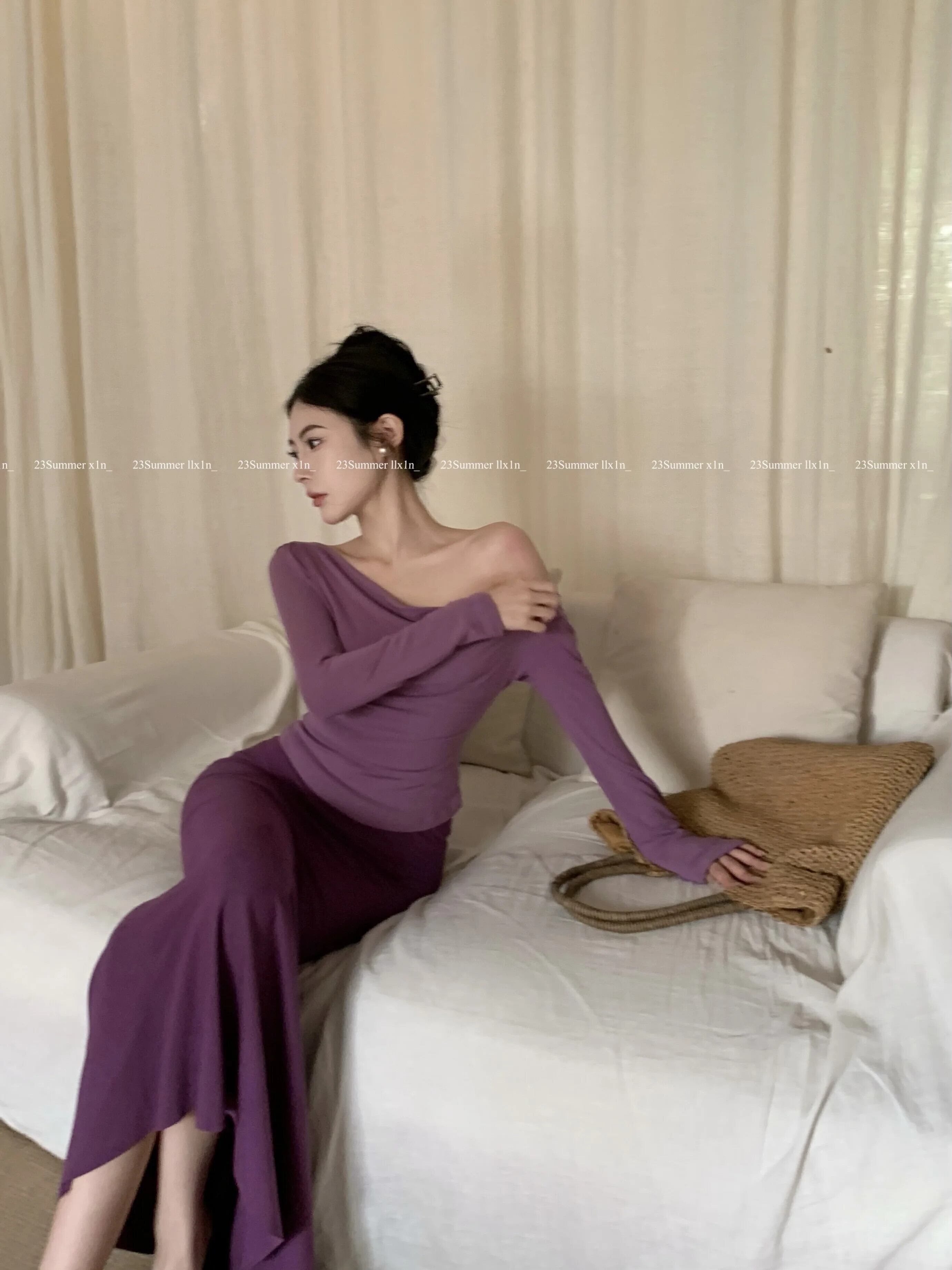 甘いホットガールセクシースーツ春オフショルダー長袖トップマーメイドロングスカートツーピースセット 大人ガーリー スウィート キュート カジュアル スプリング 春物