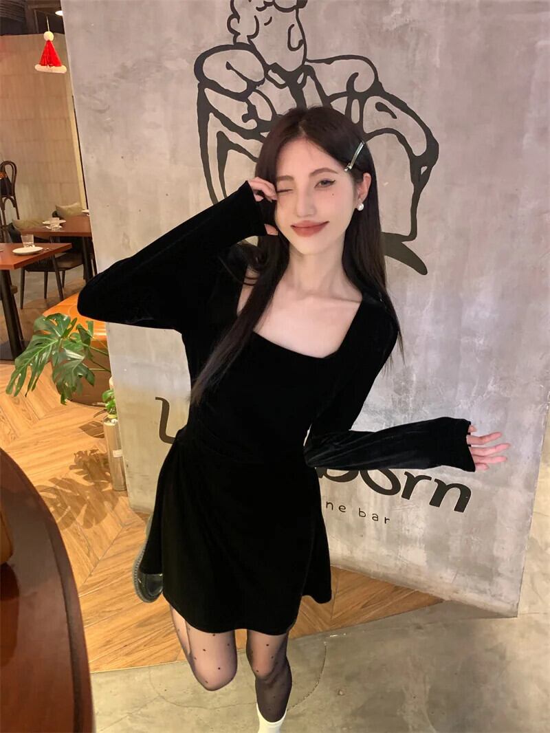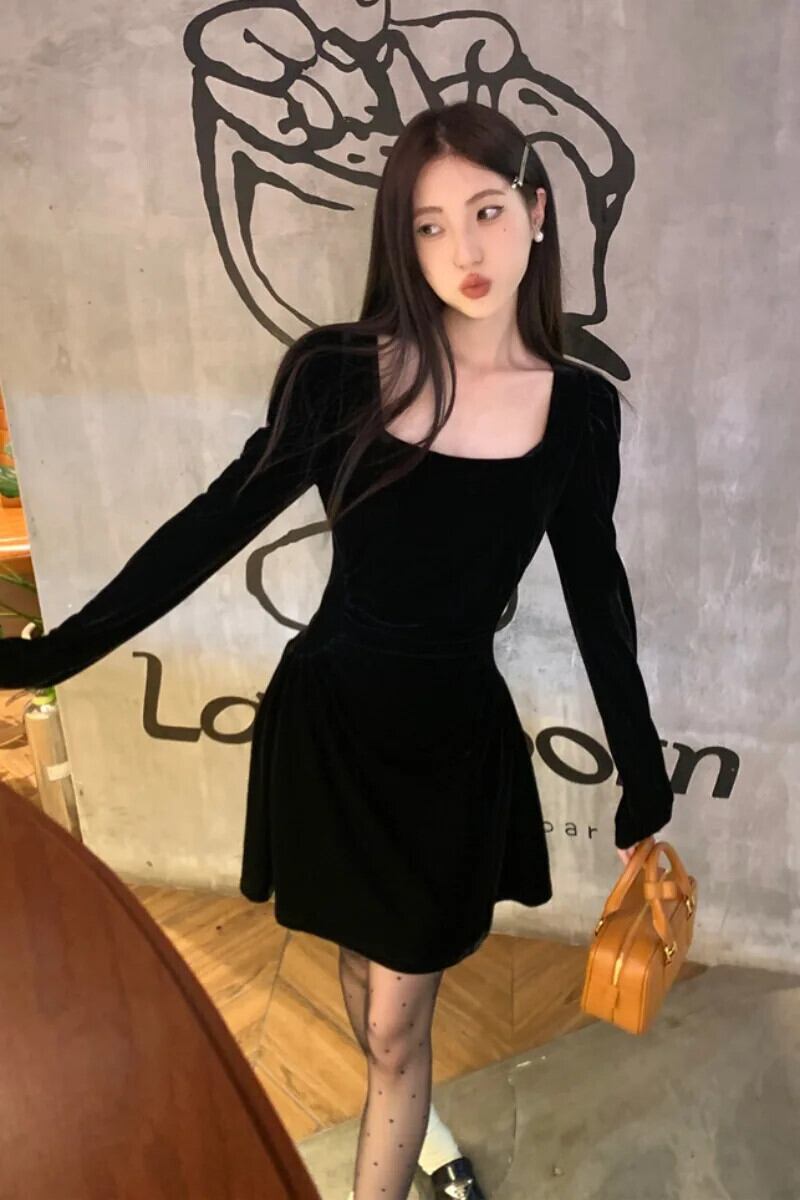 甘いホットガール黒ベルベット肥厚スリムフィットドレス秋と冬スクエアカラー長袖ドレス ロング ブラック 大人ガーリー スウィート キュート カジュアル オータム 秋物 ウィンター 冬物 スクウェア