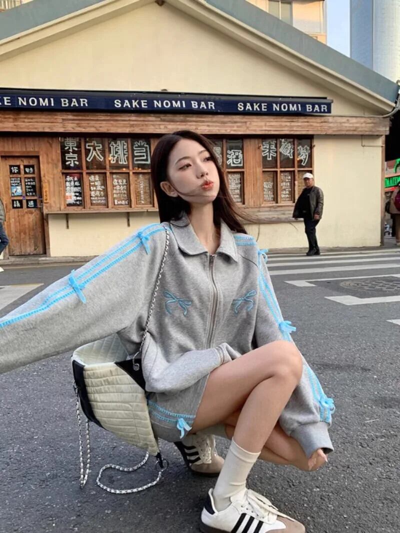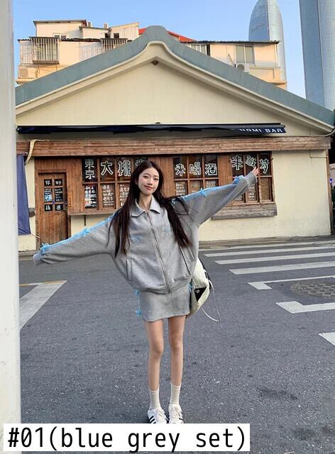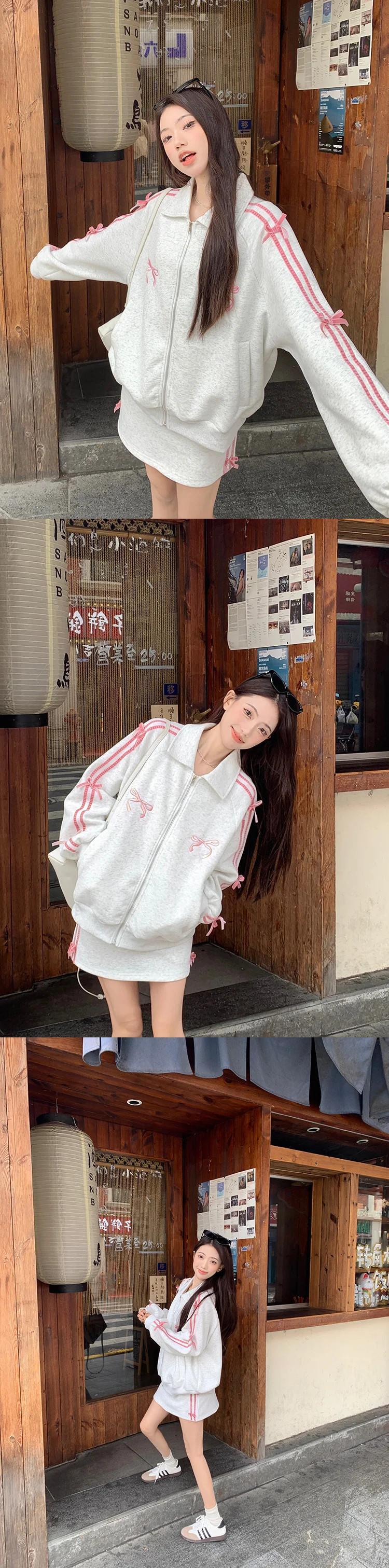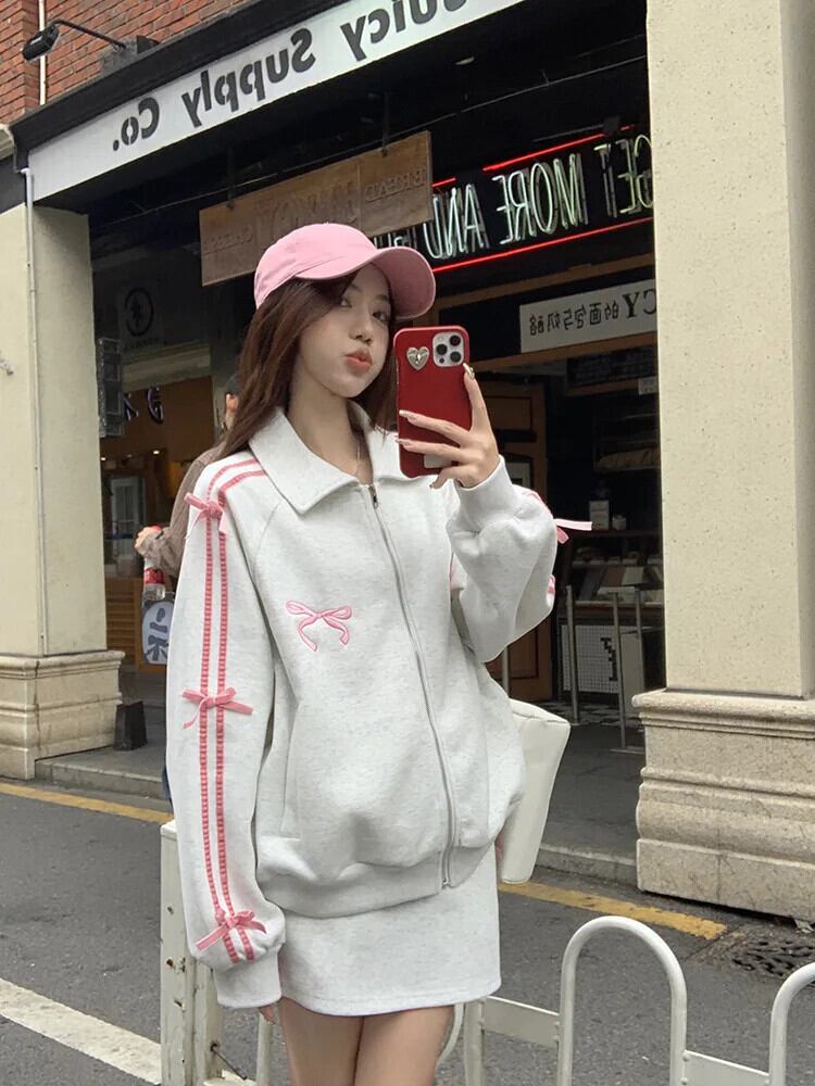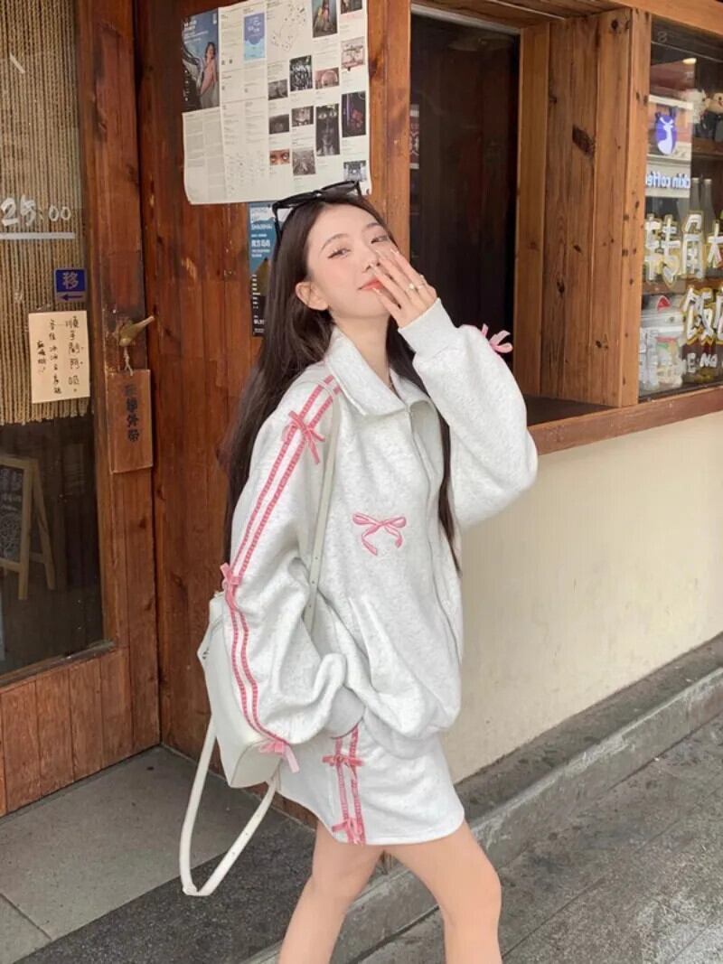 ホットガールスーツ春ボウラペルジッパースウェットシャツウエストラップヒップショートスカートツーピースセット リボン スプリング 春物