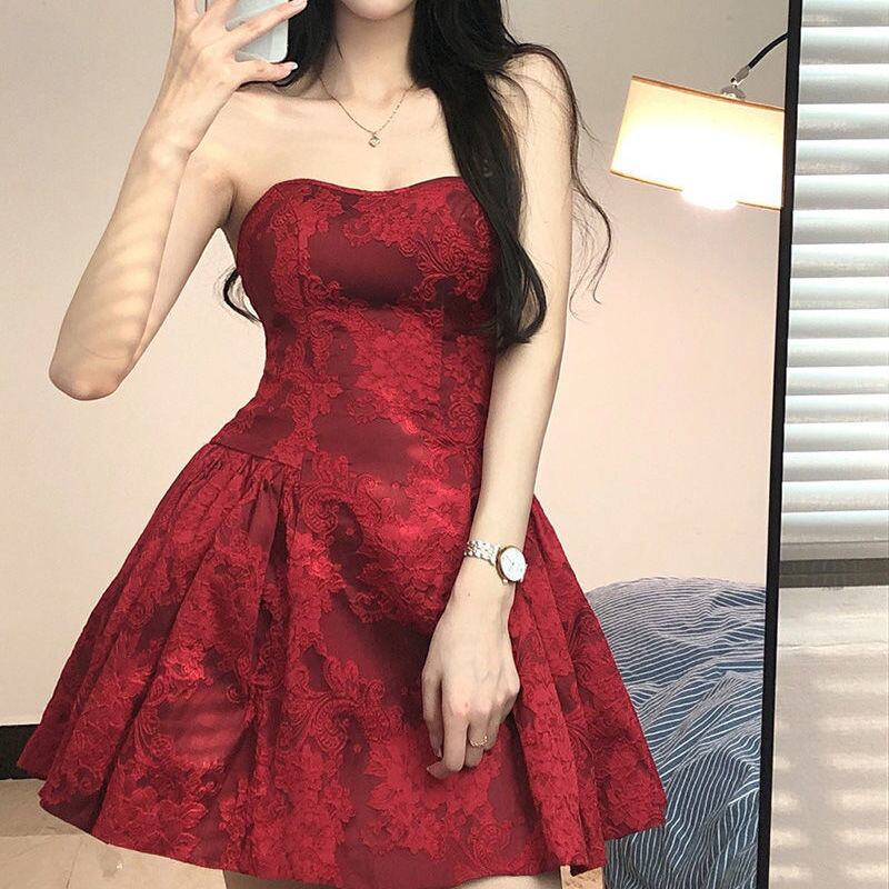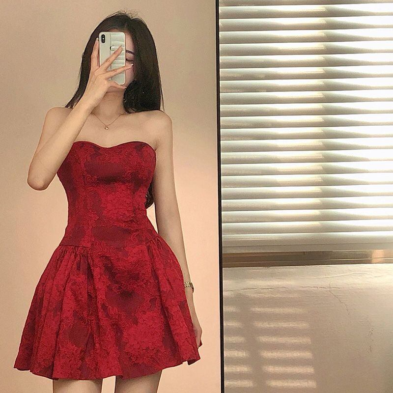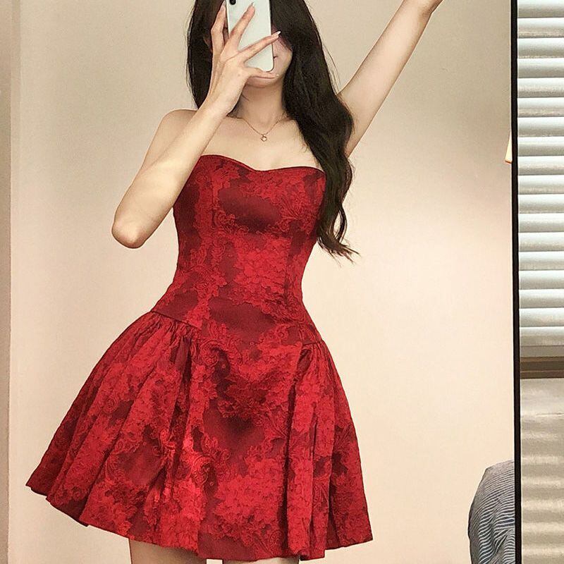 甘いホットガールレッドストラップレスプリントドレス夏スリムフィットセクシー花柄 A ラインショートドレス 大人ガーリー スウィート キュート カジュアル サマー 夏物 Aライン