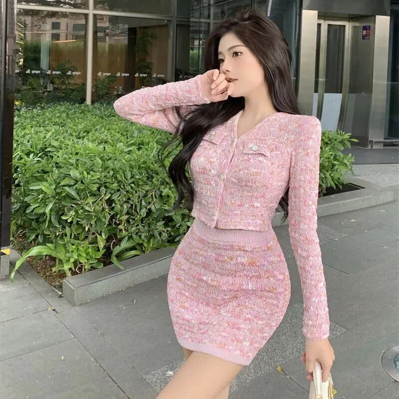 スイートホットガールスーツ春ニットカーディガンウエストヒップラップスカートツーピースセット 大人ガーリー スウィート キュート カジュアル スプリング 春物