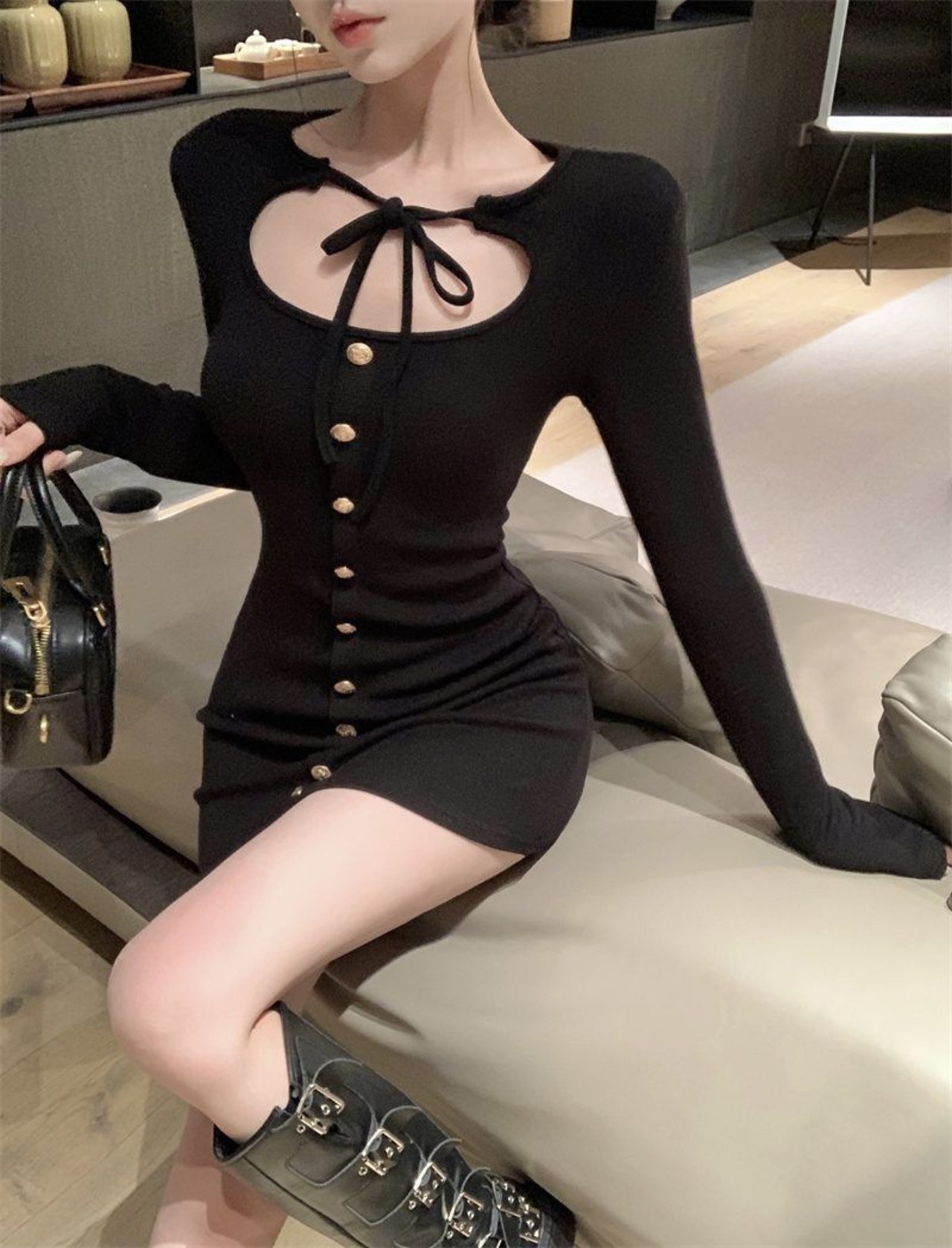 甘いホットガールスリムフィットドレス春レースアップリボン長袖ラップヒップボトムショートドレス ロング 大人ガーリー スウィート キュート カジュアル スプリング 春物
