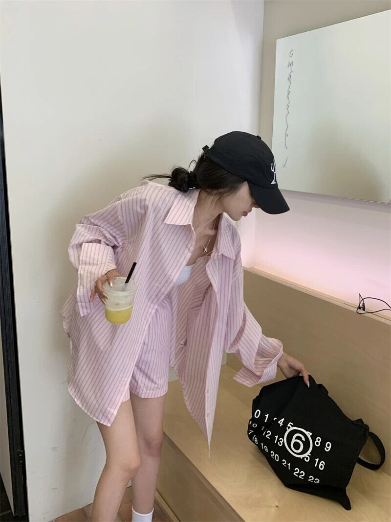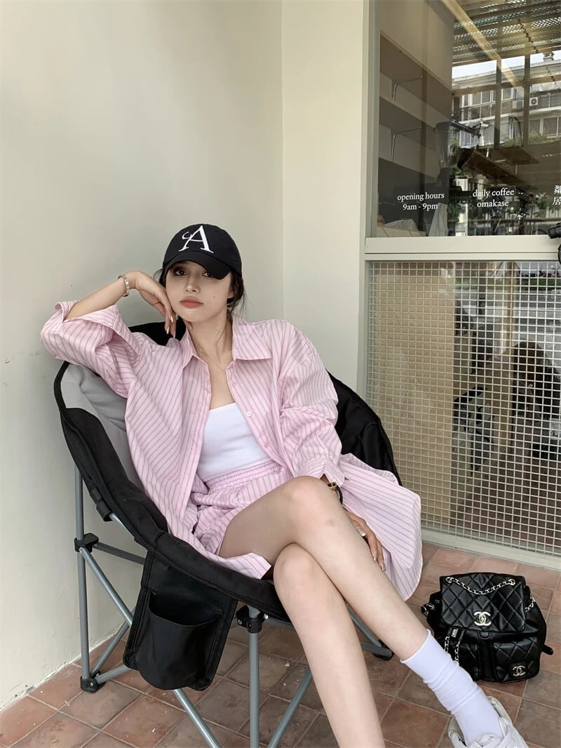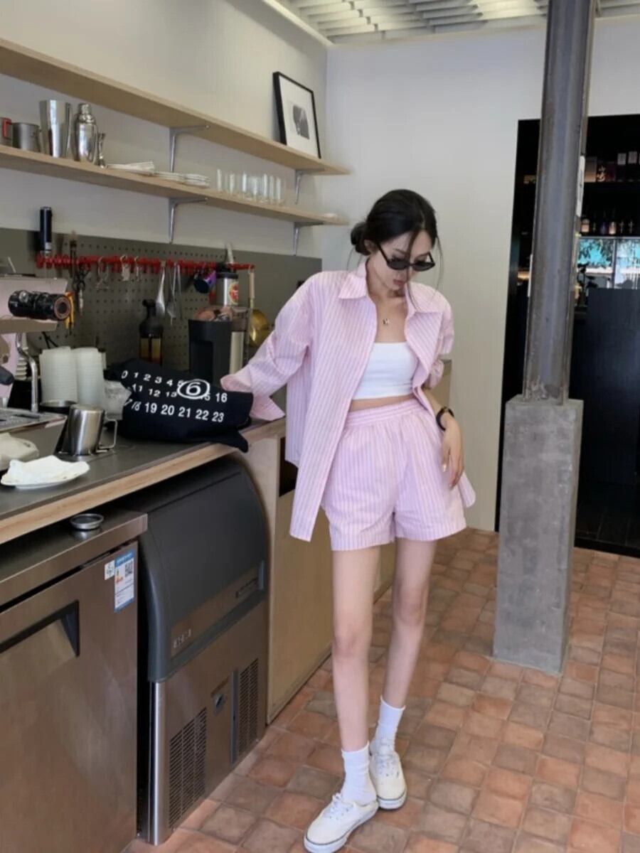 スイート ホット ガール スーツ レディース 春ストライプ コントラスト ラペル シャツ ウエスト ストレート レッグ ショーツ 2 点セット 大人ガーリー スウィート キュート カジュアル スプリング 春物 ブルマー