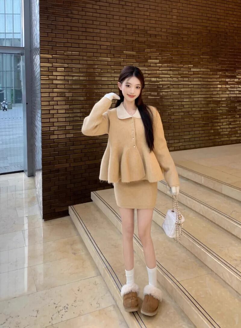 甘いホットガールニットスーツ秋/冬ピーターパン襟肥厚ニットカーディガンスリムフィットショートスカートツーピースセット 大人ガーリー スウィート キュート カジュアル オータム 秋物 ウィンター 冬物