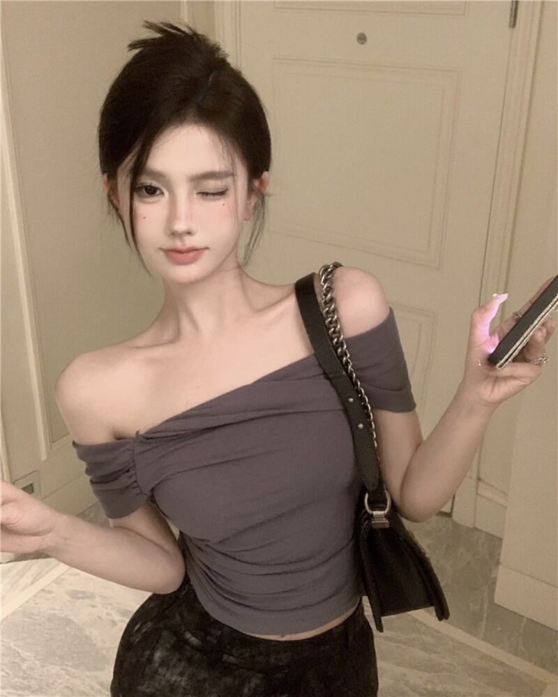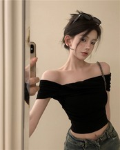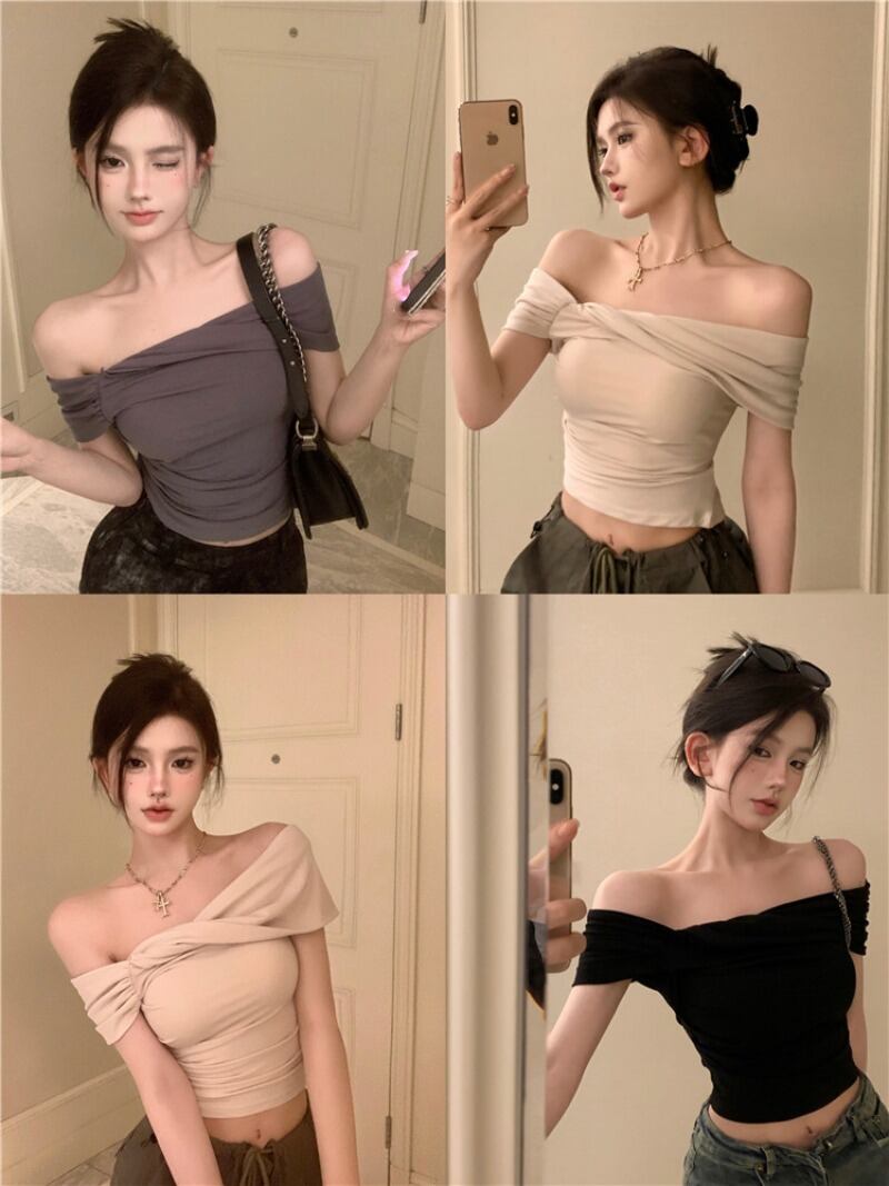 純粋セクシー甘いホットガールオフショルダーツイストトップ春/夏スラッシュネックスリムフィットショートトップ 大人ガーリー スウィート キュート カジュアル スプリング 春物 サマー 夏物