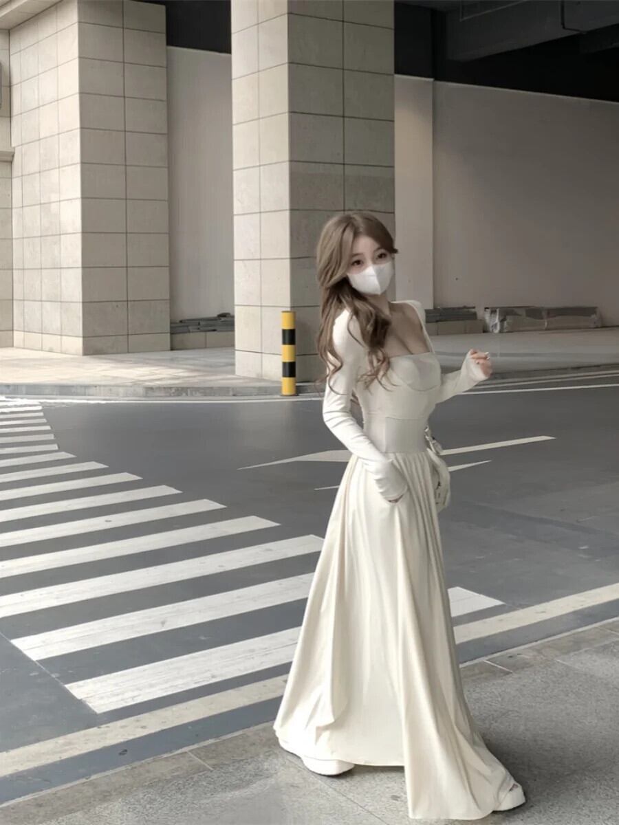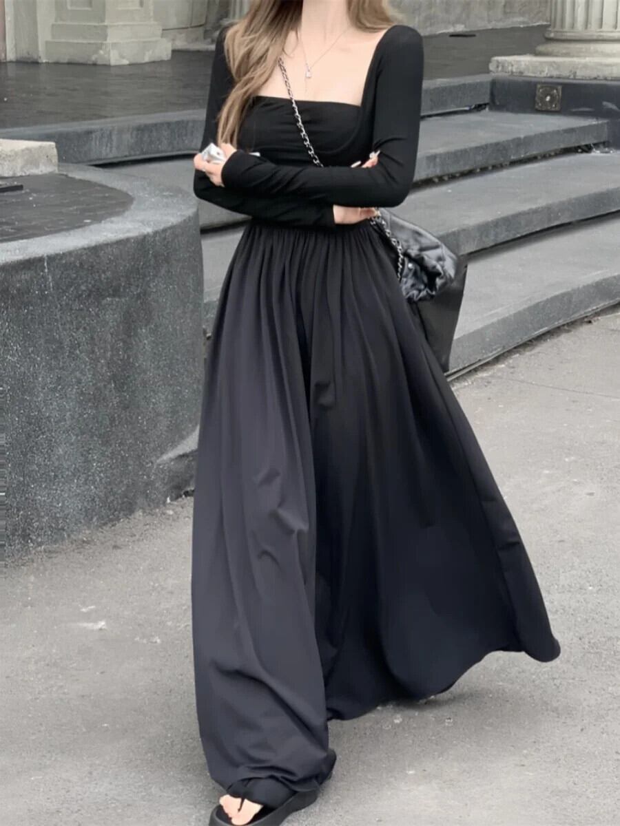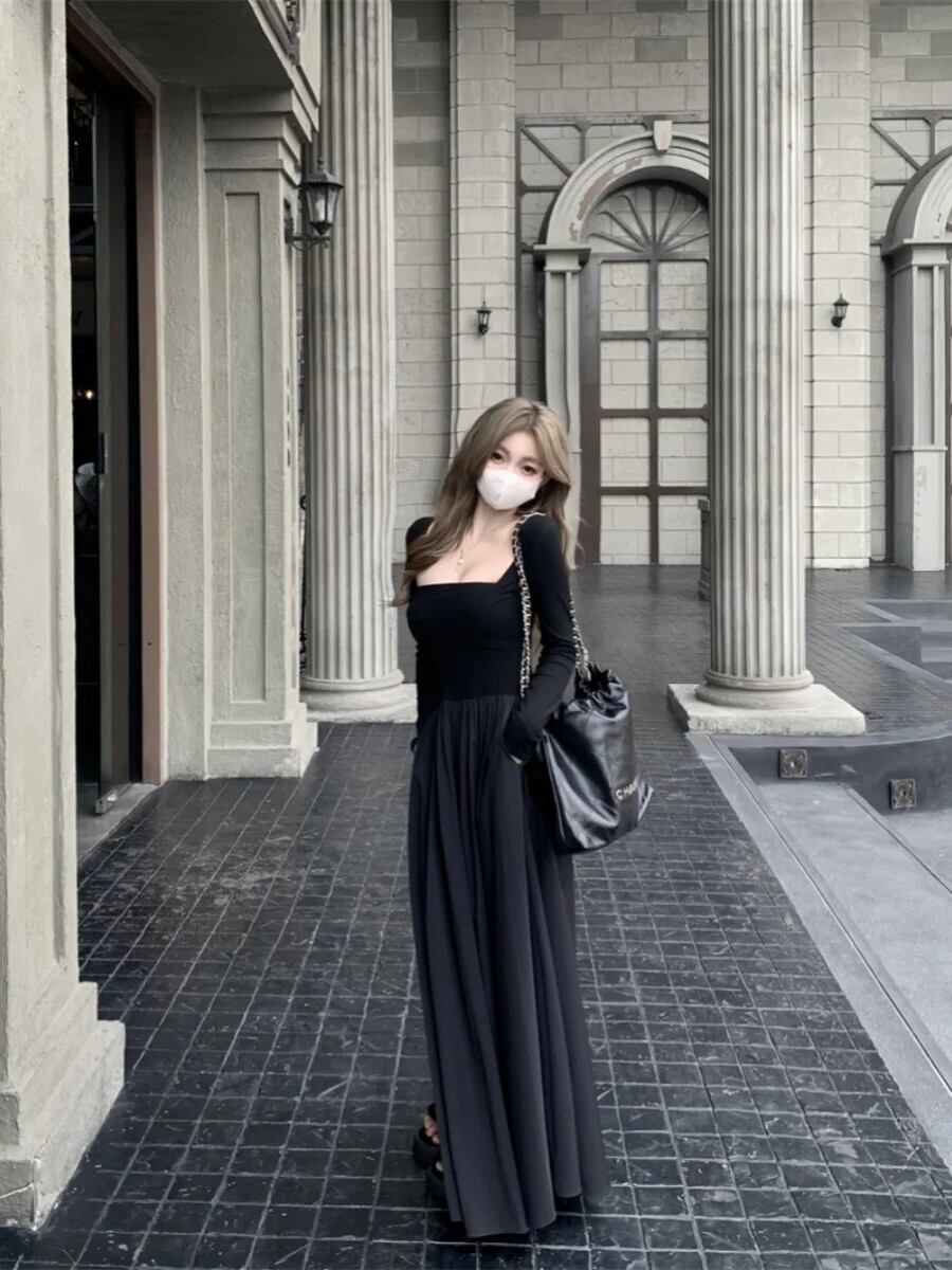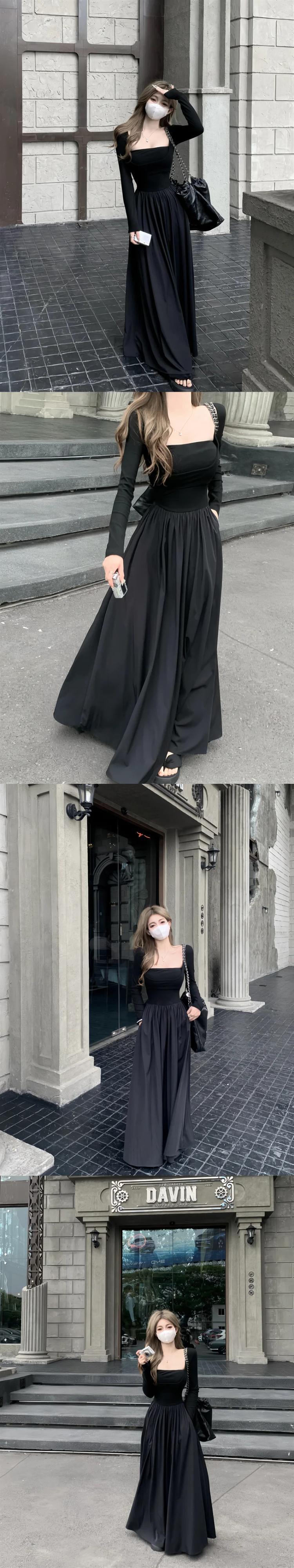 甘いホットガール偽ツーピーススクエアカラードレス春長袖パッチワークプリーツ A ラインロングドレス 大人ガーリー スウィート キュート カジュアル スプリング 春物 Aライン スクウェア