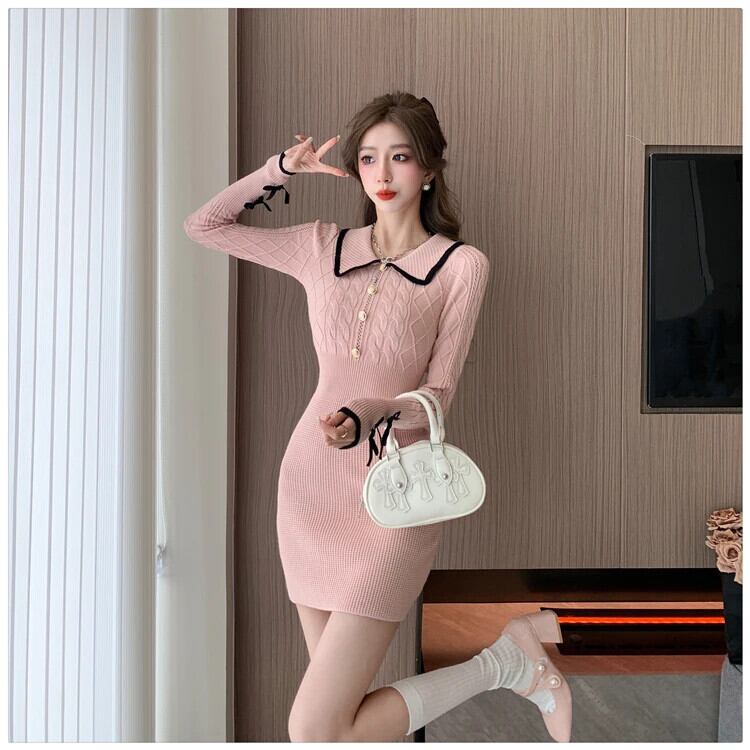 甘いホットガールカラーコントラストニットドレス秋/冬純粋セクシースリムフィットラップヒップショートドレス 大人ガーリー スウィート キュート カジュアル オータム 秋物 ウィンター 冬物