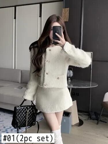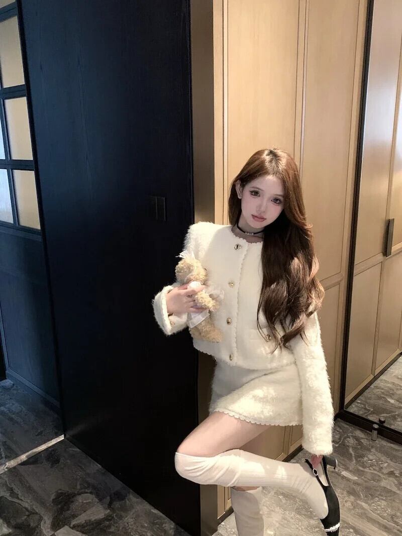 甘いホットガールスーツ冬 O ネックシングルブレストぬいぐるみコートウエストショートスカート 2 点セット 大人ガーリー スウィート キュート カジュアル ウィンター 冬物 Oネック