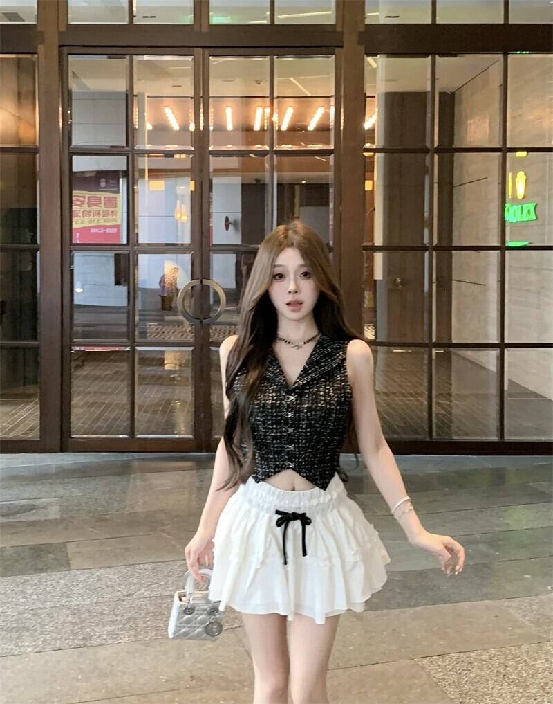 甘いホットガールスーツ夏ターンダウン襟チェック柄ベストウエストミニスカート 2 点セット 大人ガーリー スウィート キュート カジュアル サマー 夏物